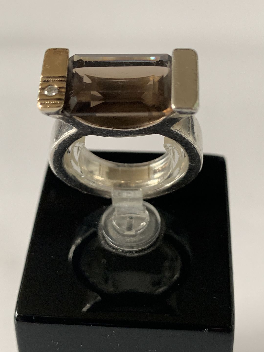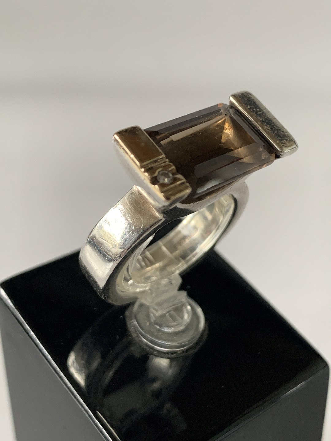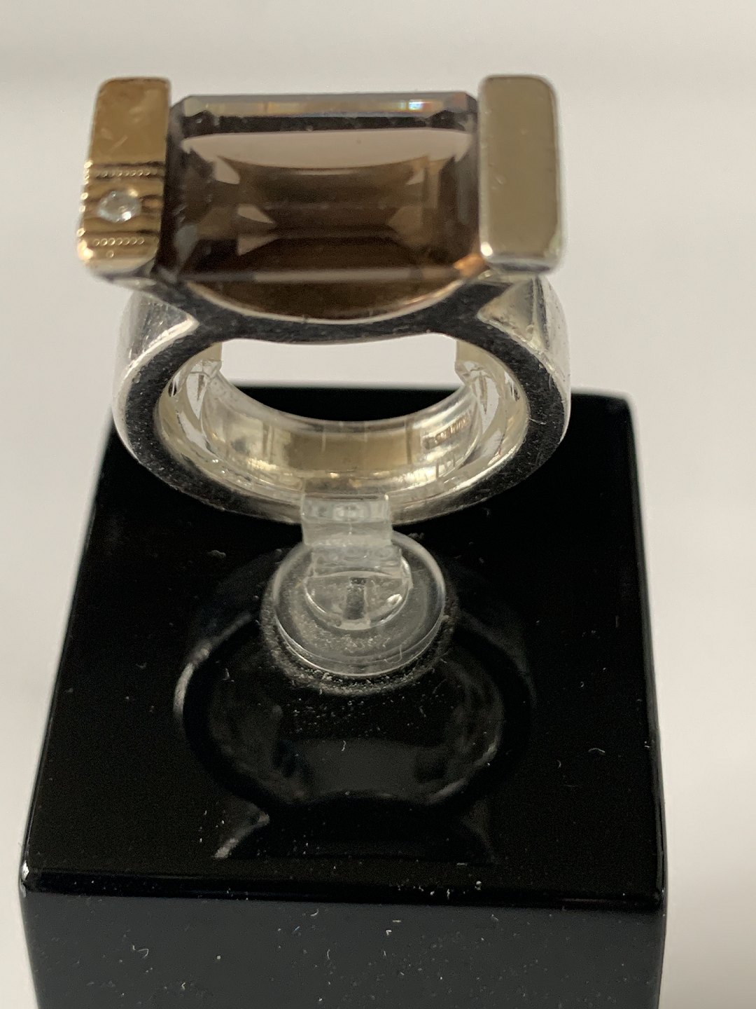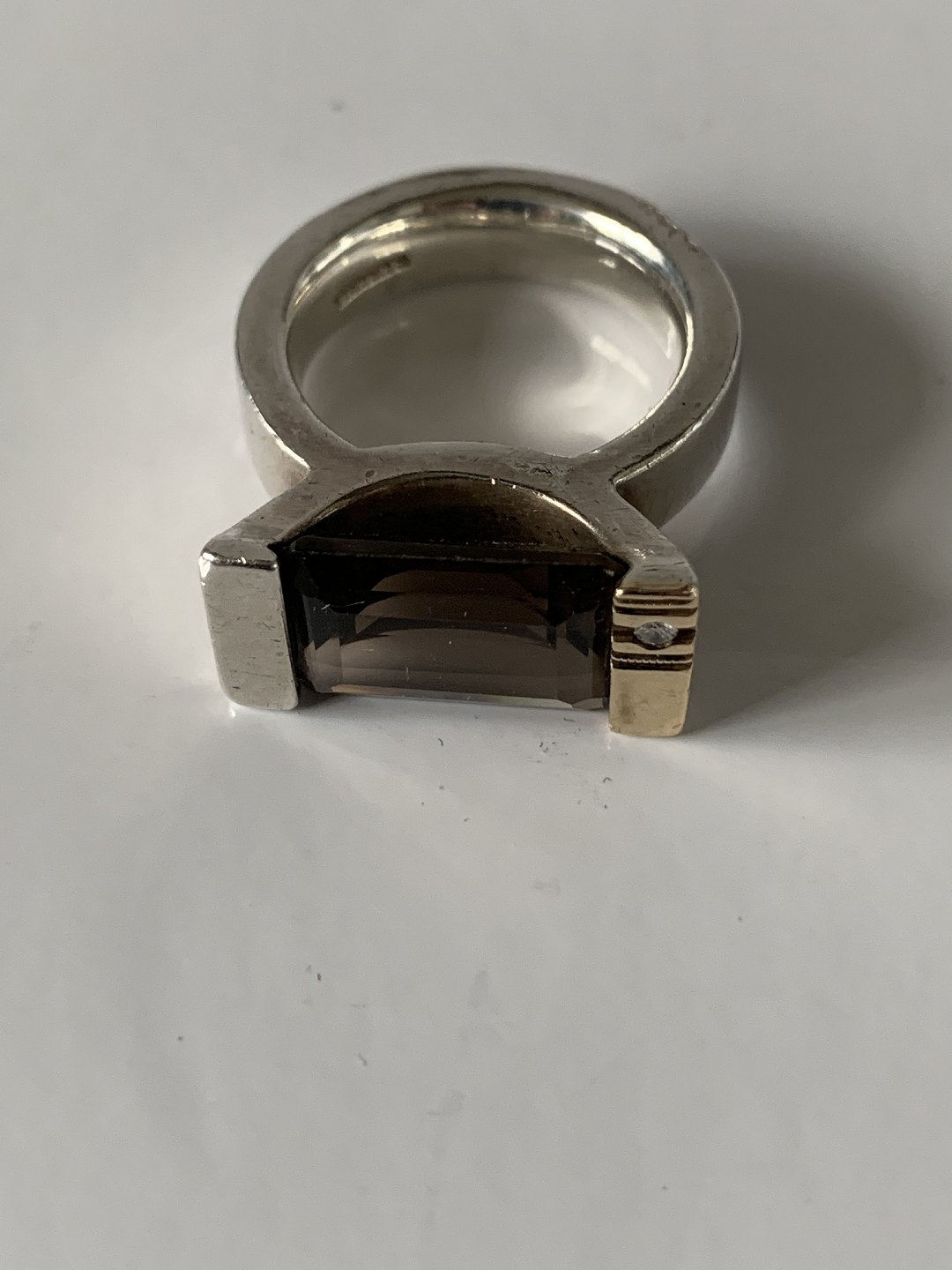 Damering i sølv med Røgtopas med indlagt guld hvor der sidder en lille brilliant
