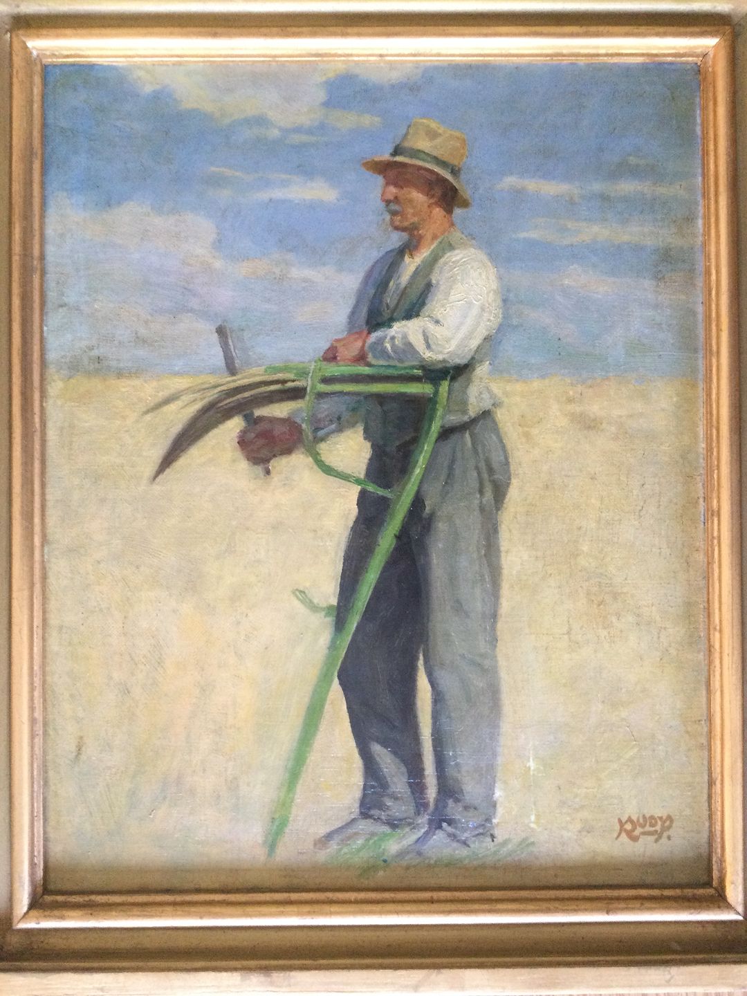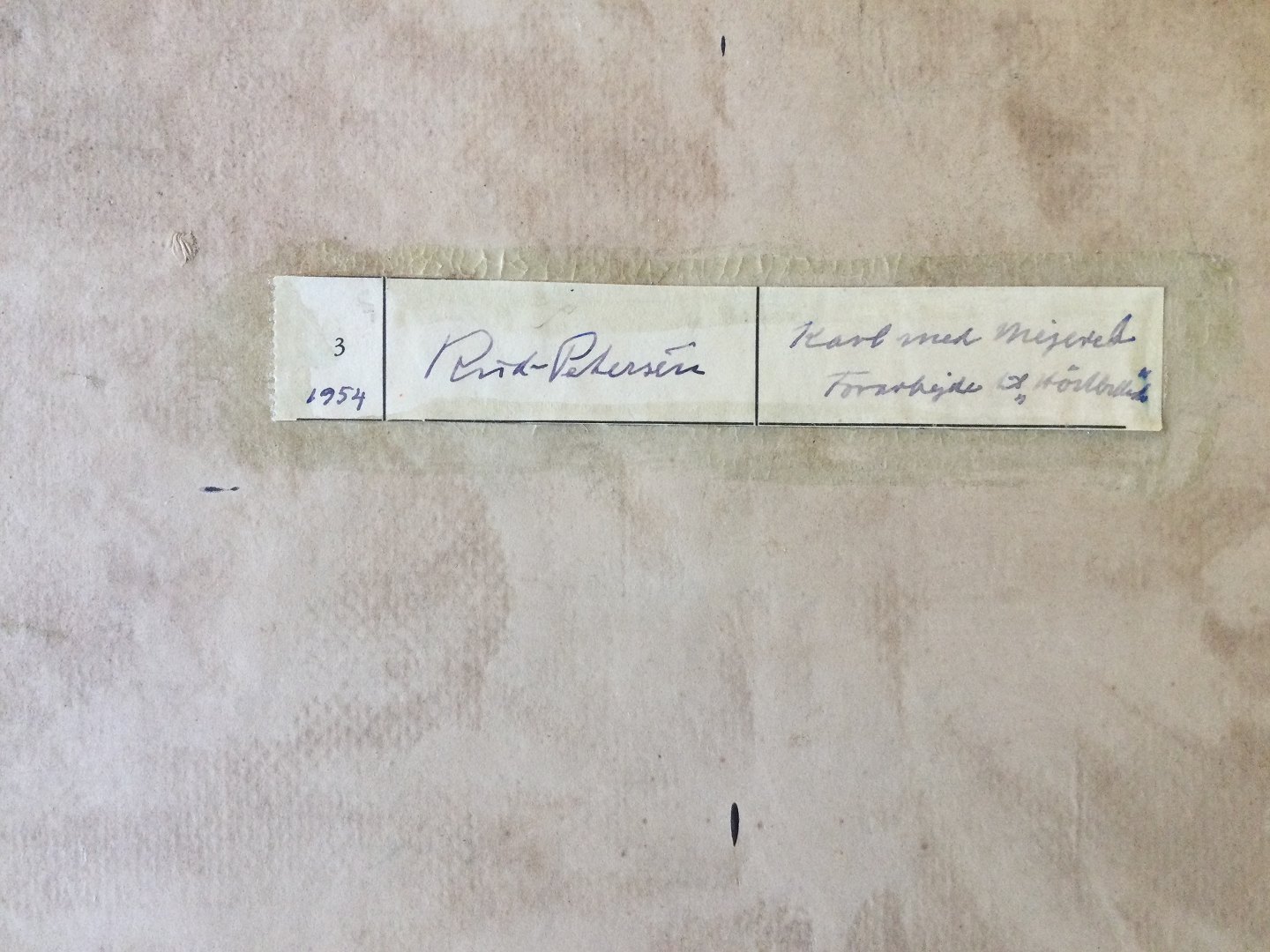 Bagpå udstillingsmærkat 1954 "Karl med Mejeredskab" Forarbejde til Høstbillede.