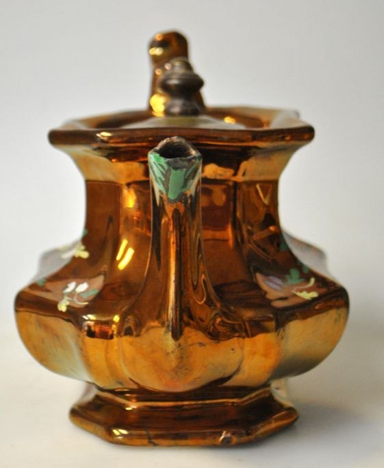 Engelsk lustre thekande, 19. årh. Med håndmalede blomsterdekorationer og messinglåg. H: 17 cm Dia: 22 cm.