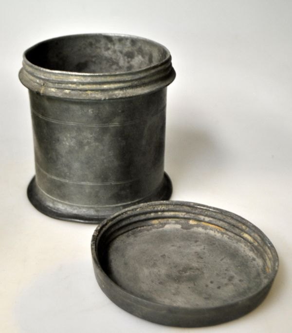 Rund tobaks dåse af tin, 18. årh. Danmark. Med skruelåg. Utydlig stemplet. Højde.: 10 cm. Dia: 9,5 cm.
