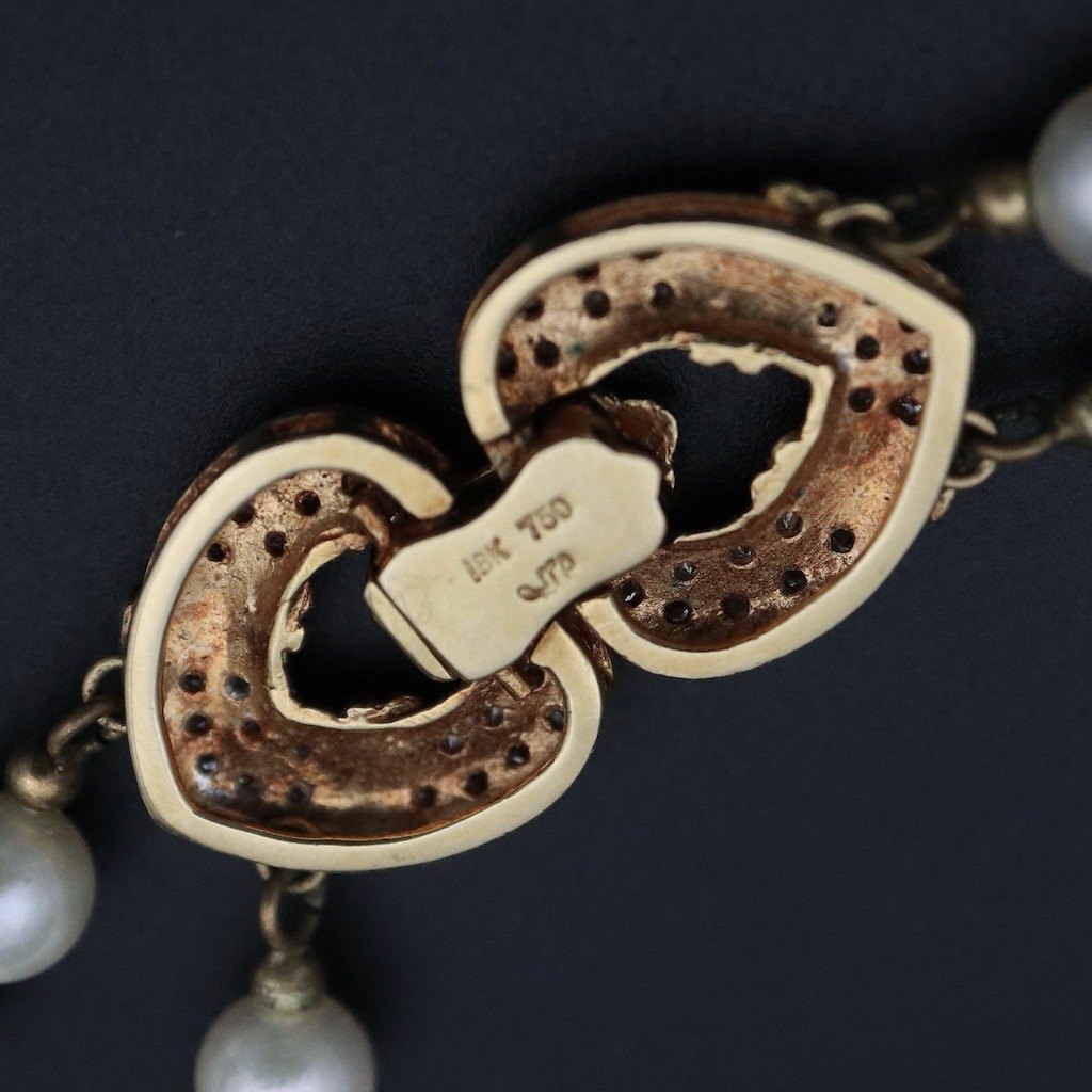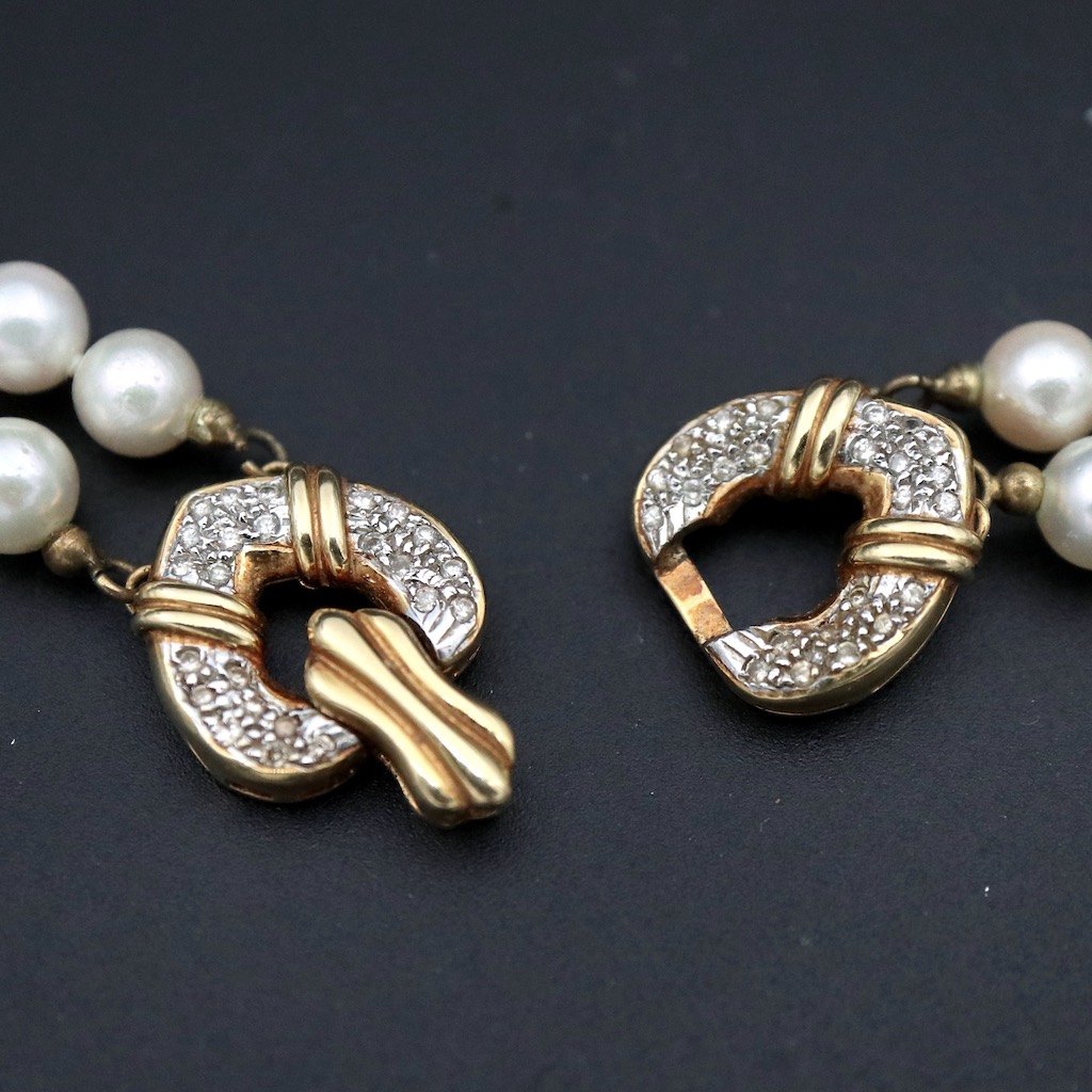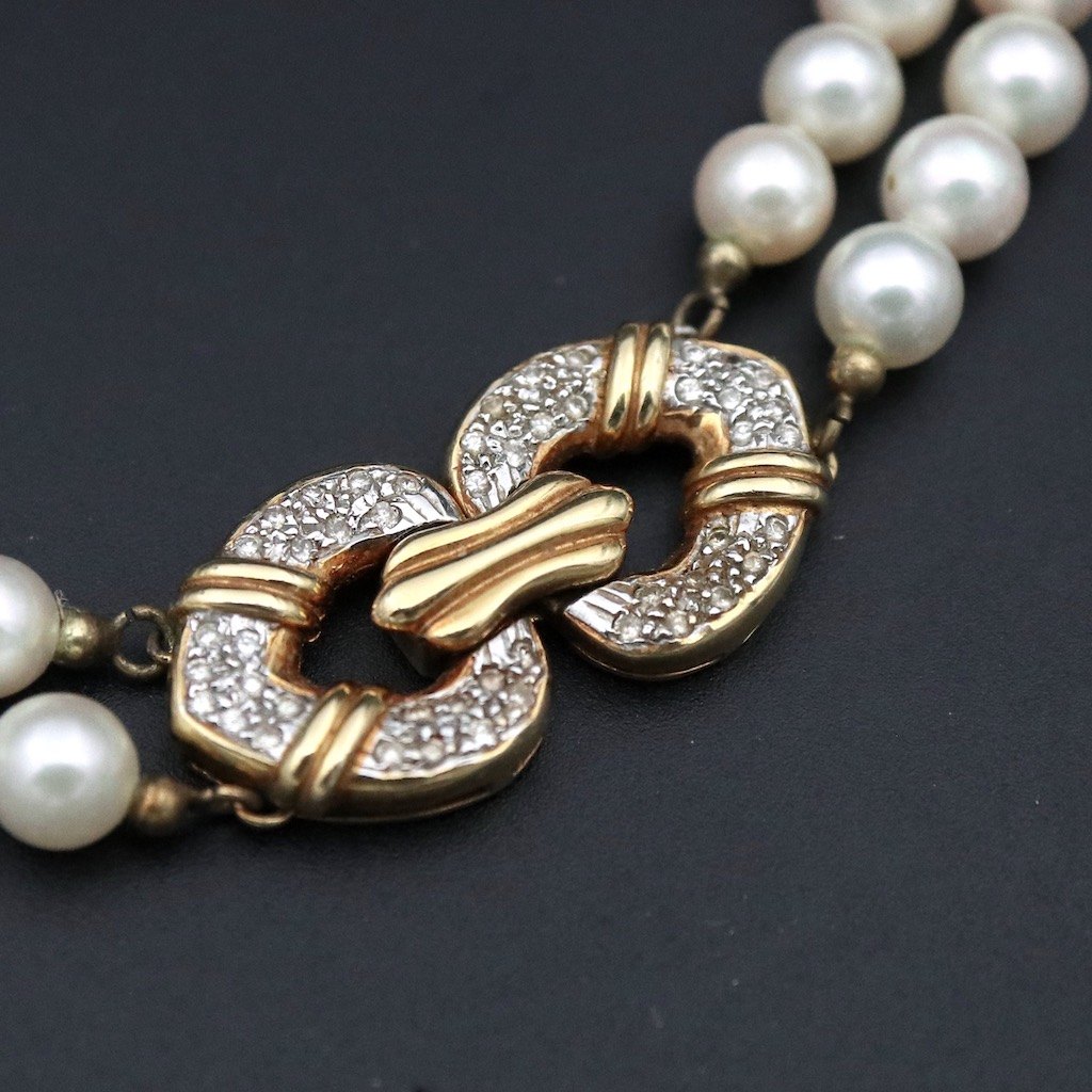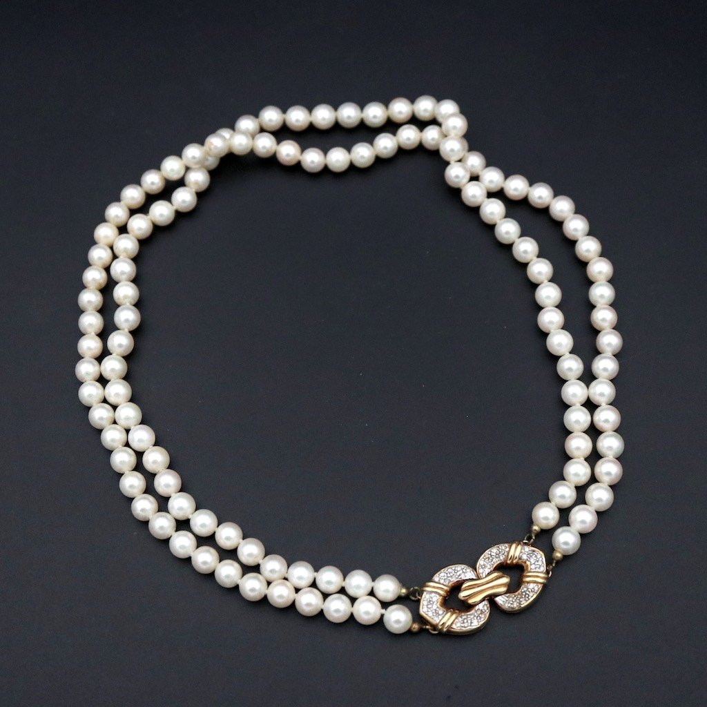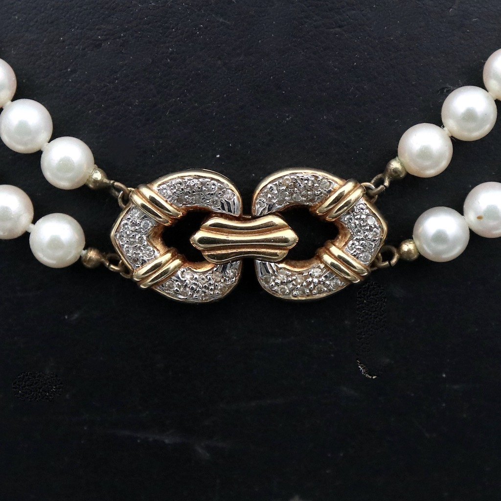 To-radet perlekæde med diamantlås i 18k guld.