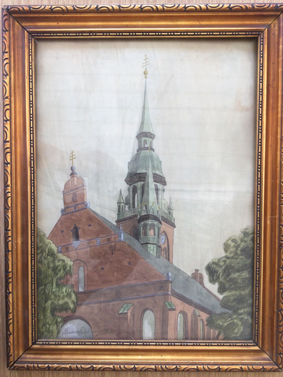 Akvarel af Valdemar Christensen 1930 - Tårnet på Helligåndskirken.