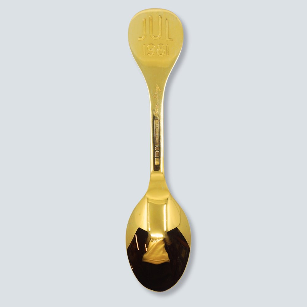 Falke Bang for Anton Michelsen; A christmas spoon 1981. Spoon of gilt sterling silver with enamel. Designed by Falke Bang, b. 1912, d. 1998. Danish design silver.