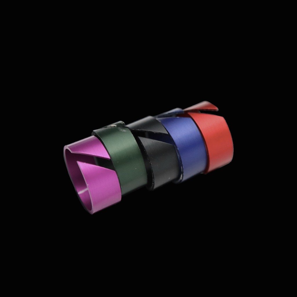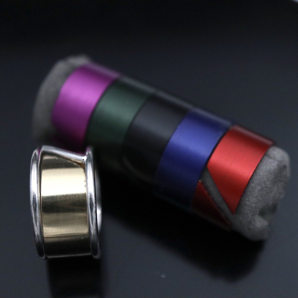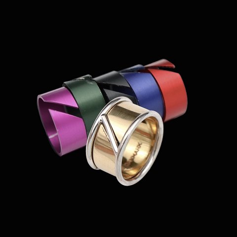 Ring 18k hvidguld med midterring i 18k guld samt udskiftelige ring i farvet aluminium.