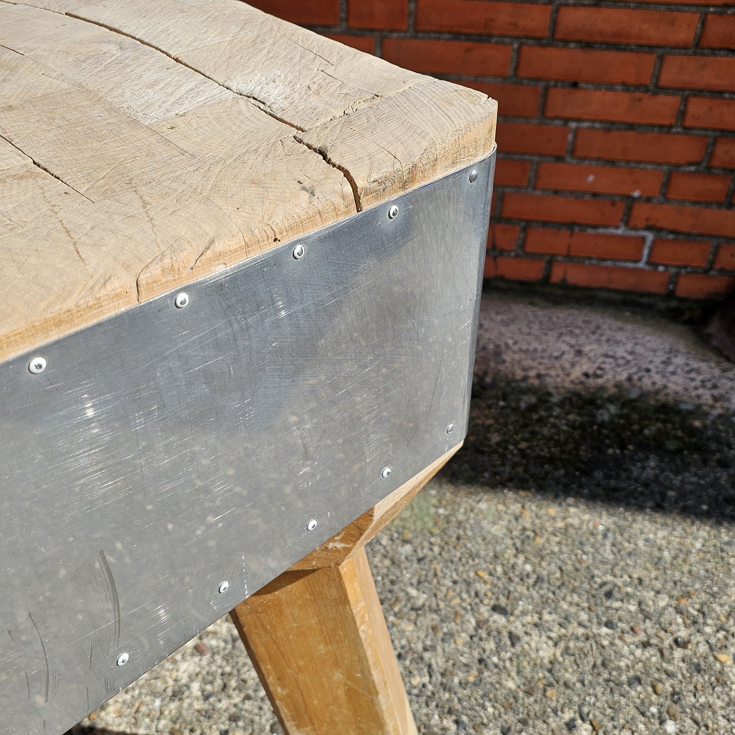 Huggeblok sat sammen af stave af bøgetræ. På siden omkranset af stålplade. Hårdttræ sko på ben.