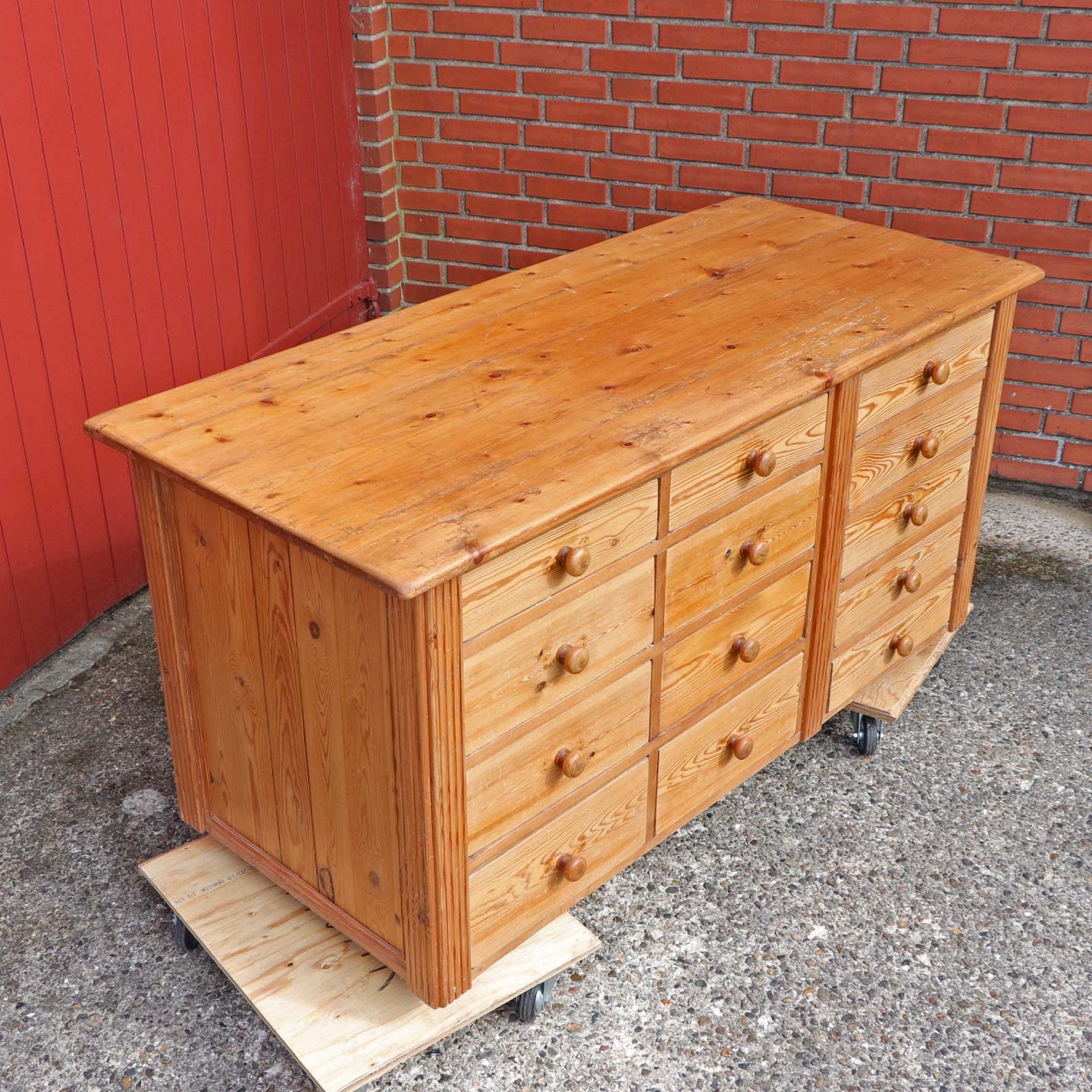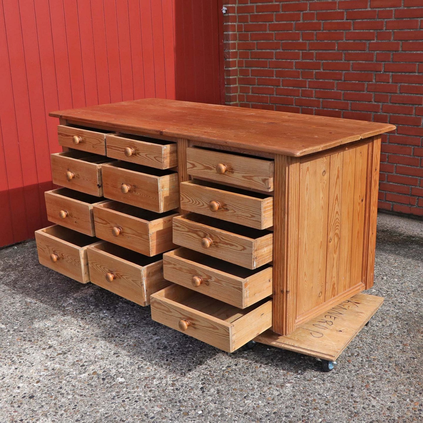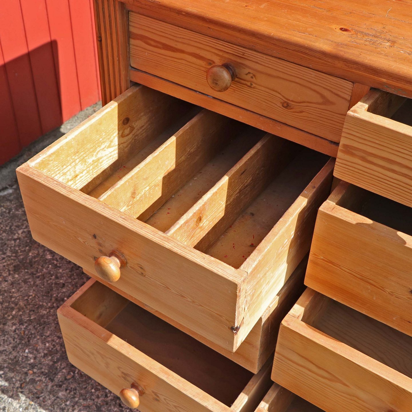 Købmandsdisk i solid fyrtræ med tretten skuffer i forskellige størrelser. Disken er lakeret med træknopper og rummer god mulighed for opbevaring.