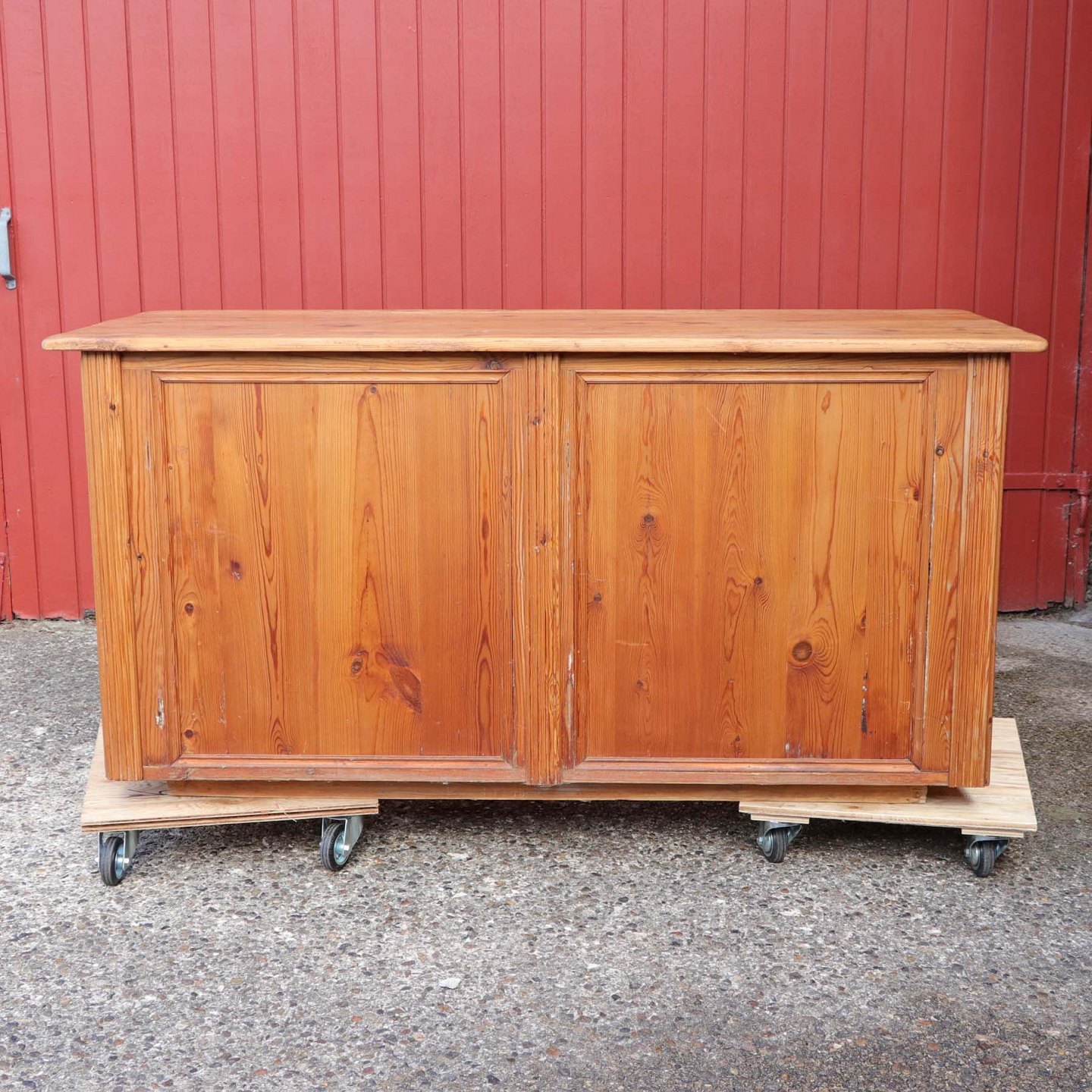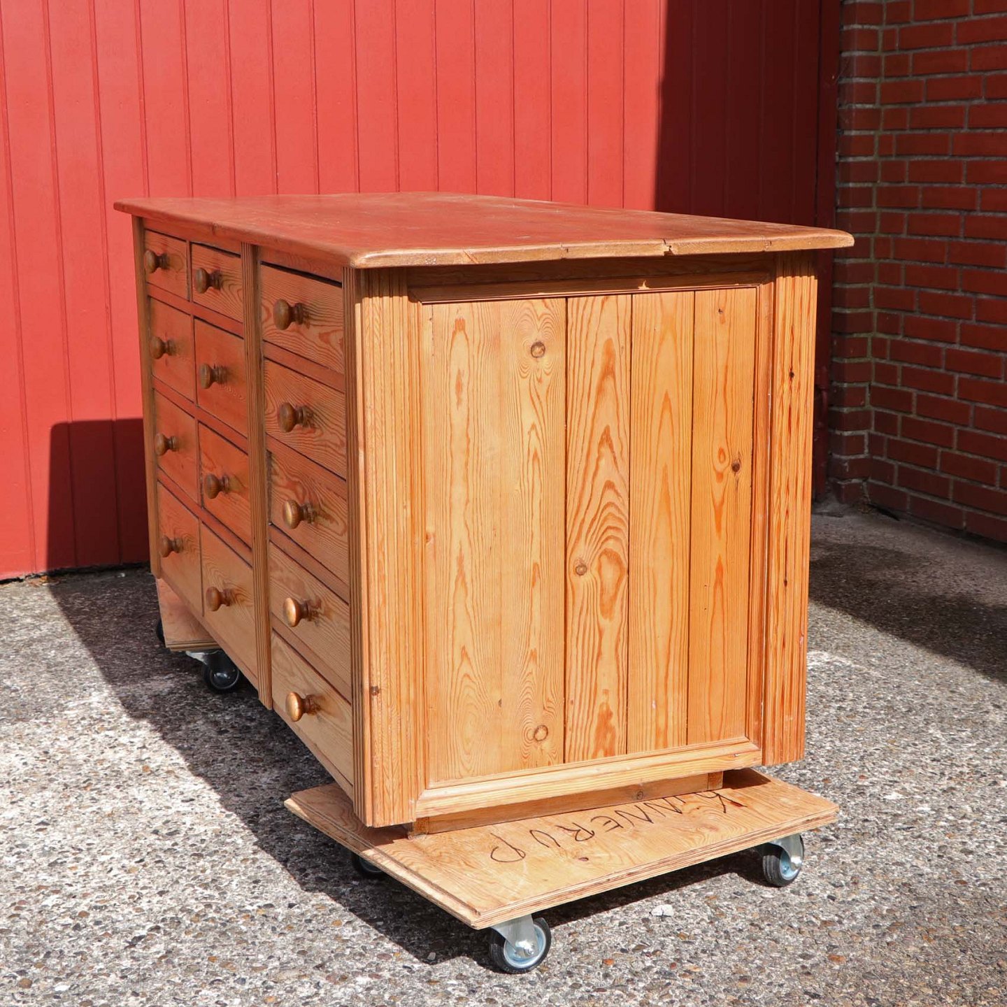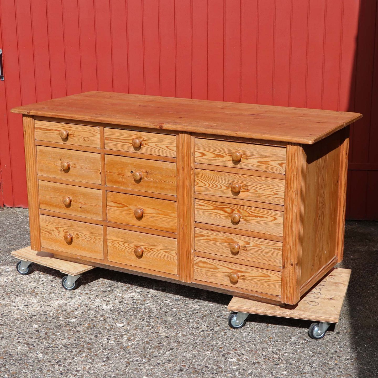 Købmandsdisk i solid fyrtræ med tretten skuffer i forskellige størrelser. Disken er lakeret med træknopper og rummer god mulighed for opbevaring.