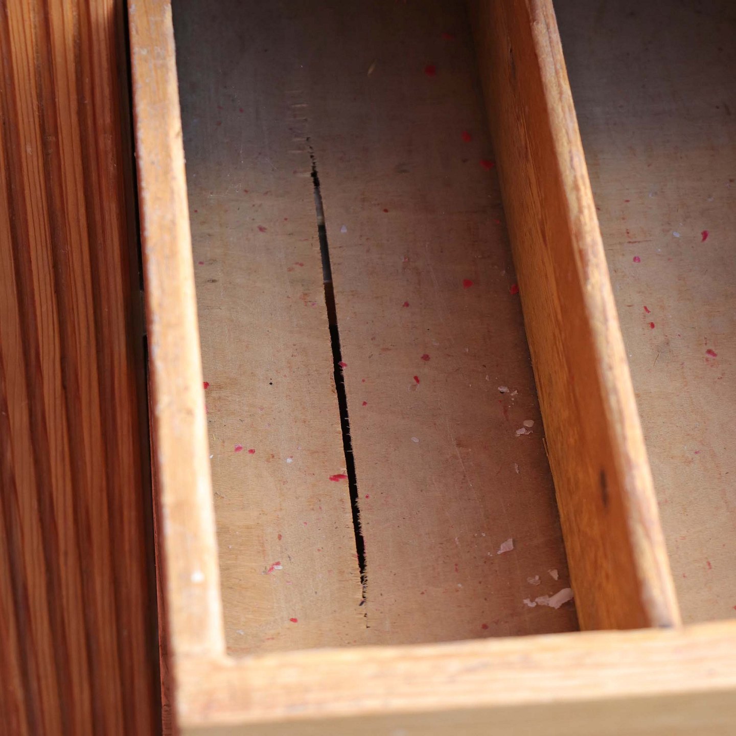 Fremstår med brugsspor og en revne i bunden af en enkelt skuffe samt få tip i træet i bunden af en anden skuffe