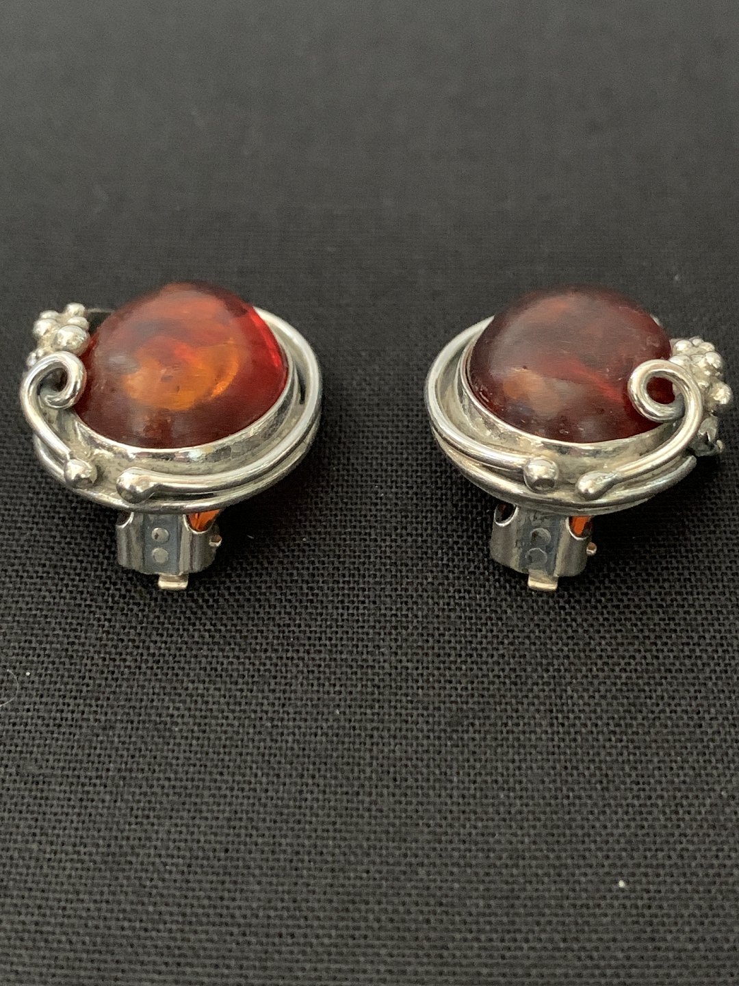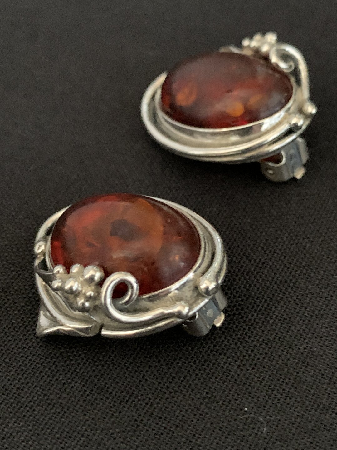 Øreclips i sølv med flot detaljeret mønster med rav
