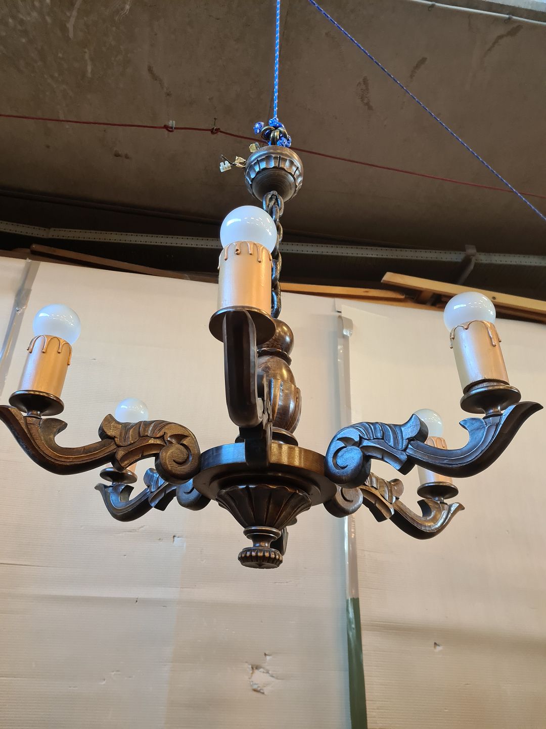 6-Armet lysekrone i massivt birketræ, fra 1930erne.