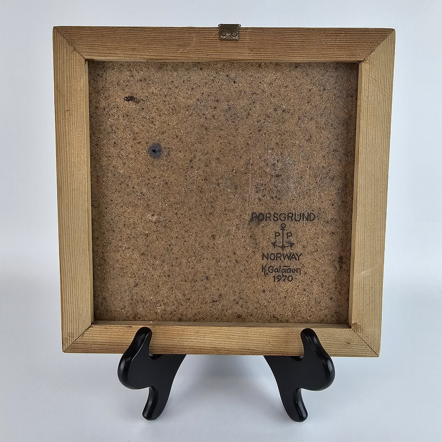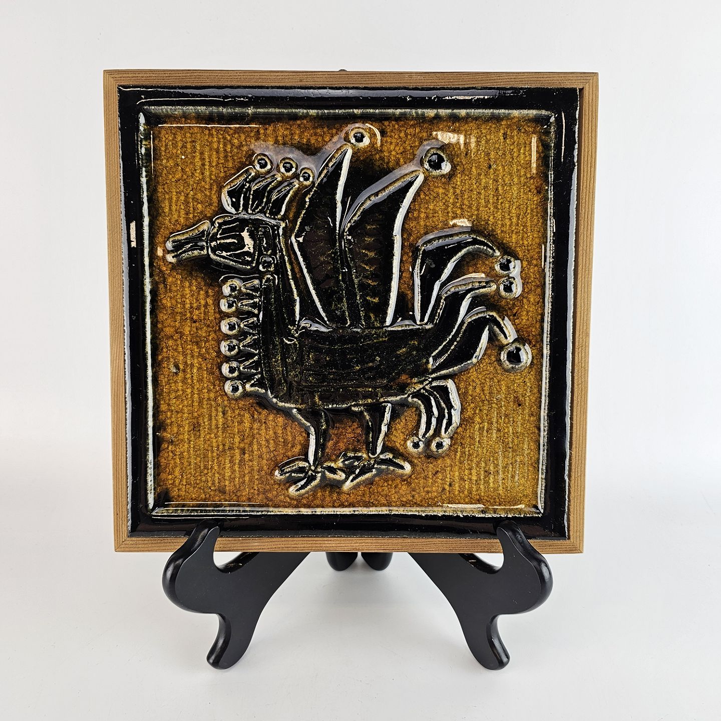 Relief i sten med træramme. Motiv af en hane. Dateret 1970