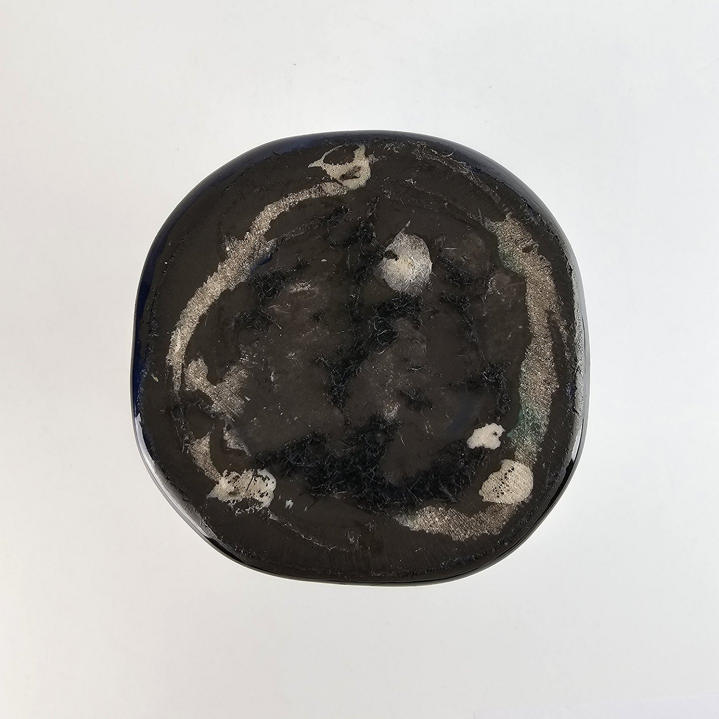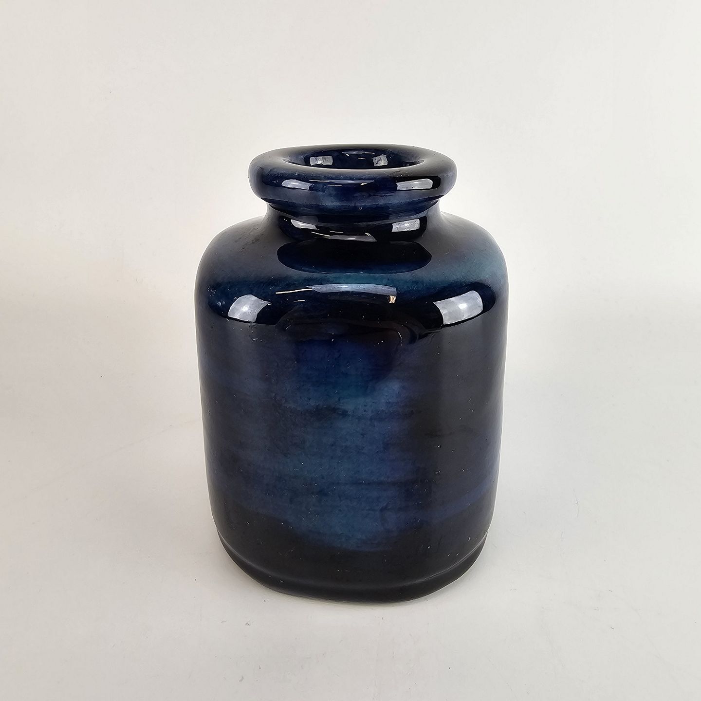 Flot firkantet vase med rund munding og hjørner. Stentøj glaseret i dybe blå nuancer