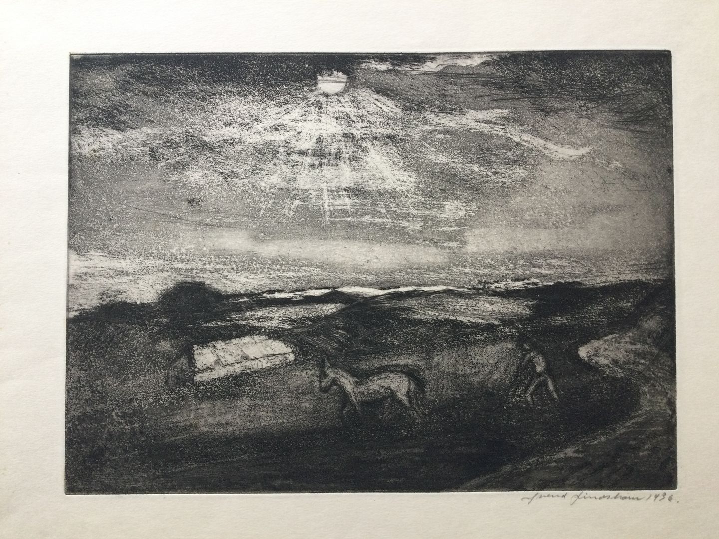 Text available in Danish: Radering af Svend Lindstrøm - Pløjende mand i landskab ved Flensborg 1936.