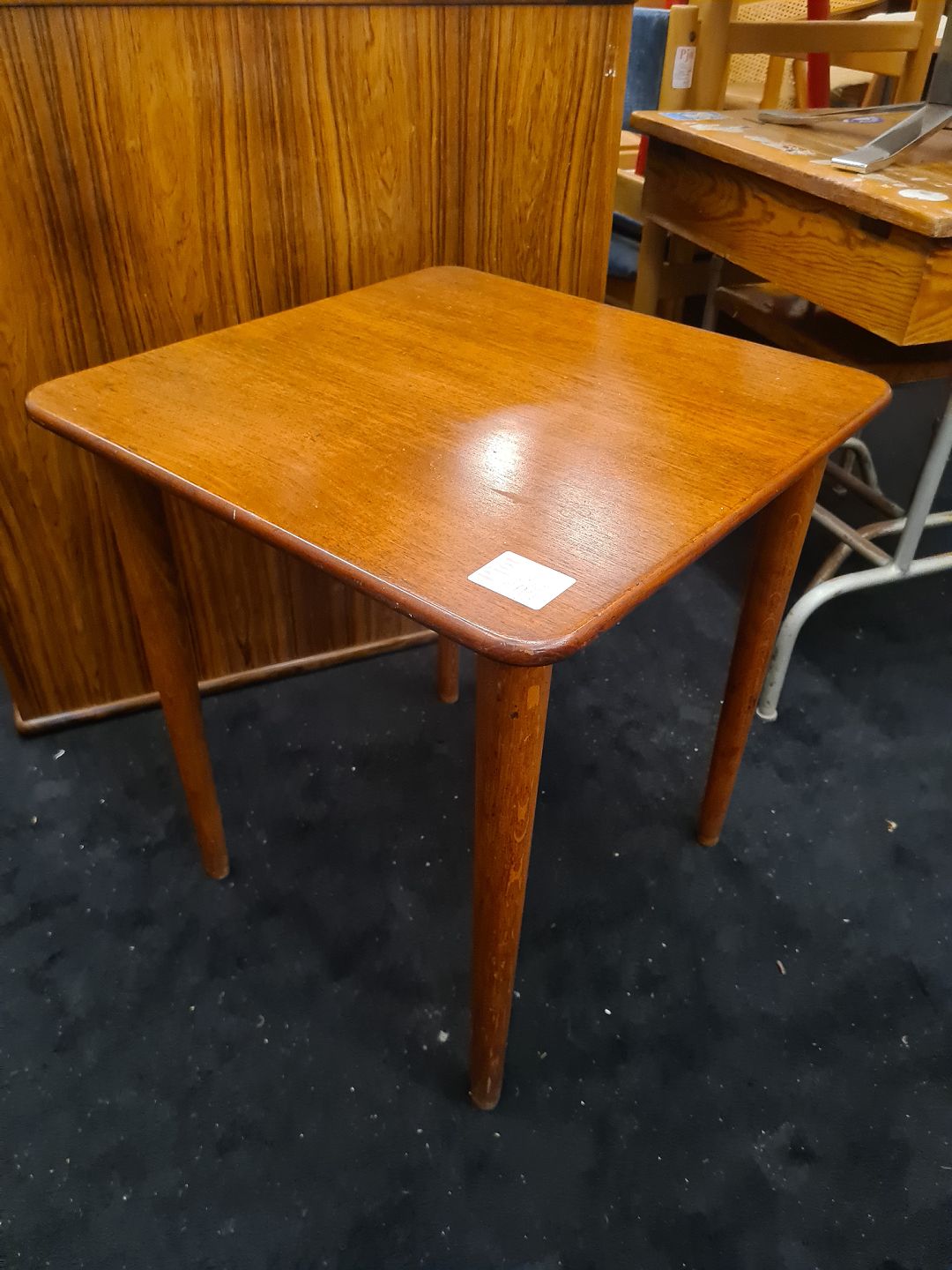 Kvadratisk lampebord fra 1960´erne med plade i teak og ben i eg. Fremstår pænt og velholdt uden nævneværdige brugsspor.