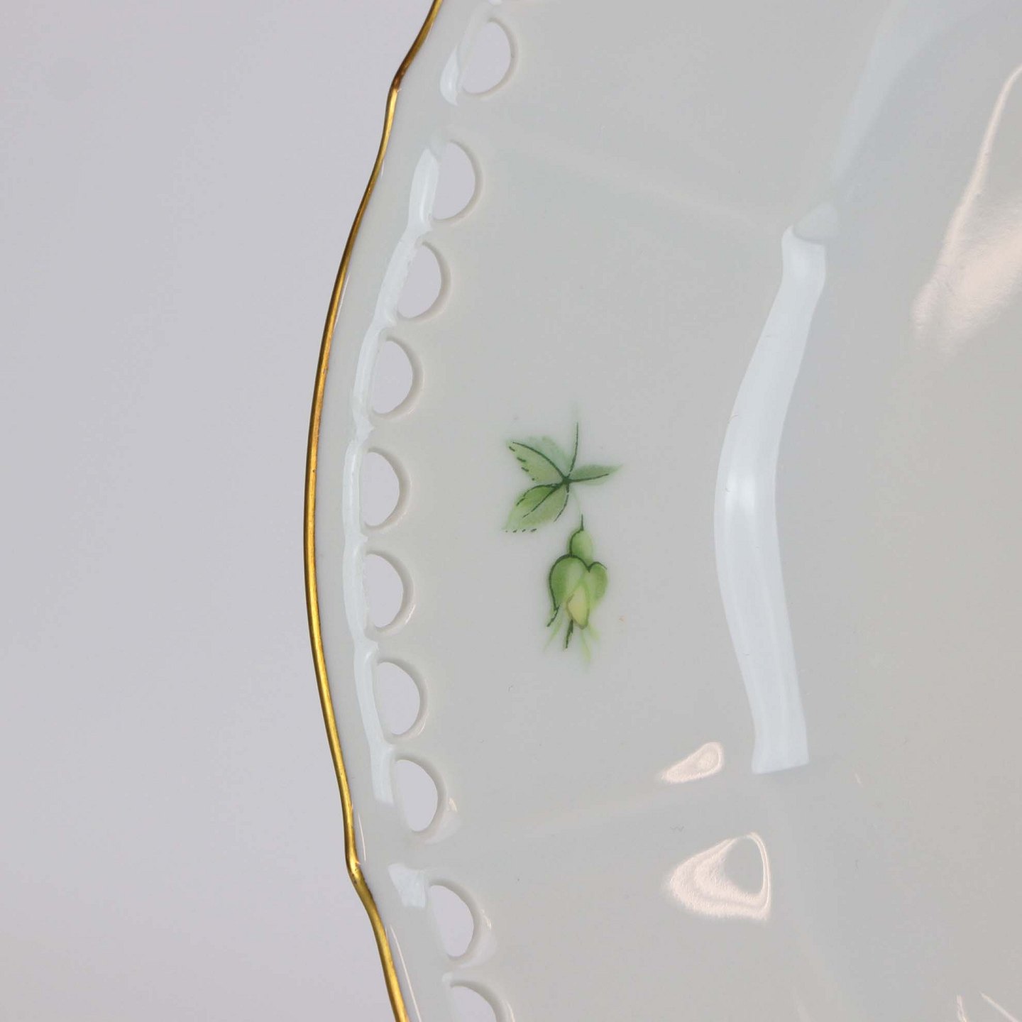 Service i glat hvidt porcelæn med perforeret og lige knækkede kanter dekoreret med gule blomster og gylden kant