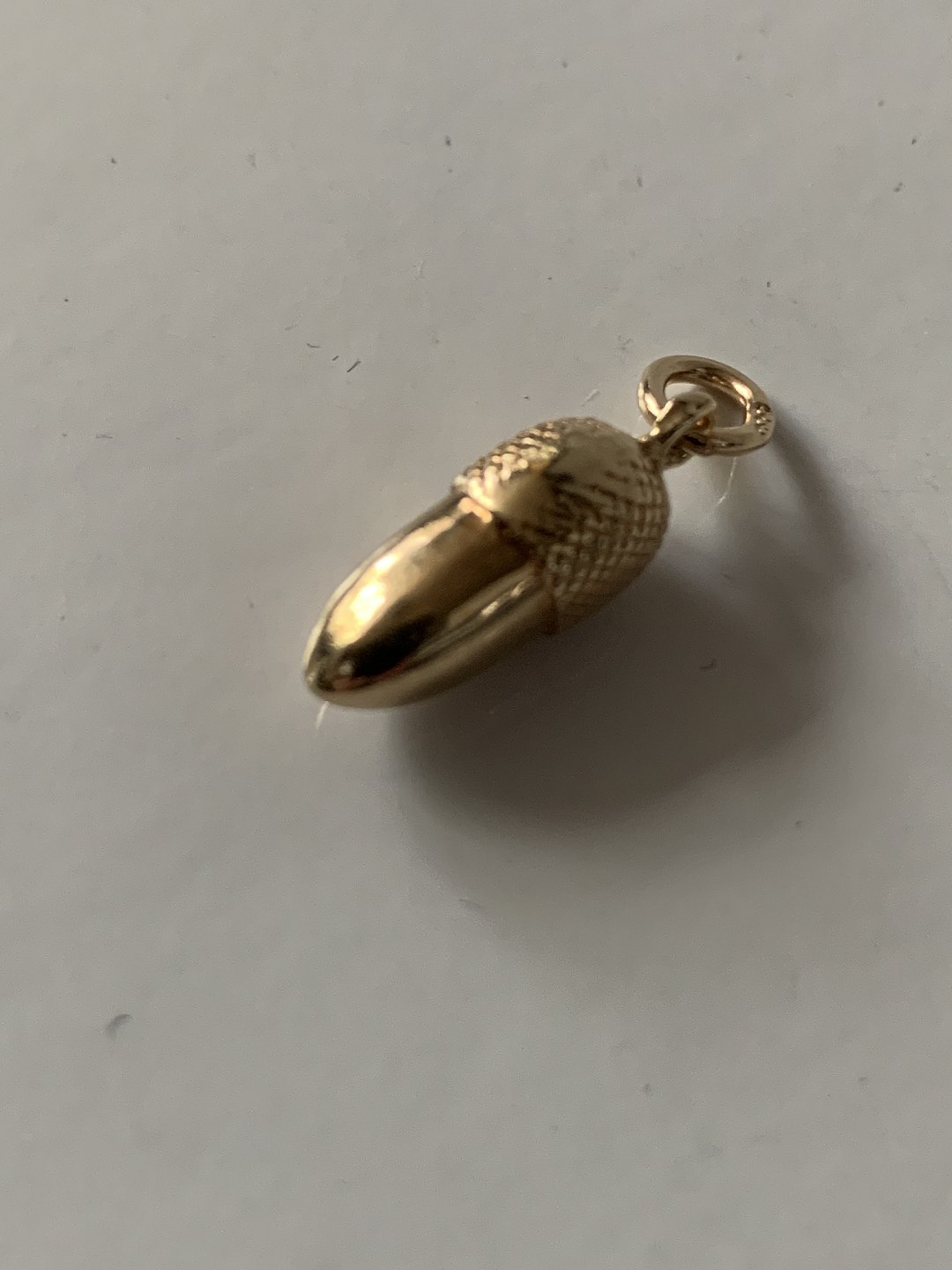 Vedhæng/charm til armbånd formet som agern i 14 karat guld. Et sødt lille vedhæng, der kan bruges i kombination med andre vedhæng til at skabe dit eget unikke armbånd. Vælg 2,3 eller 4 små vedhæng og gør dit armbånd til noget helt specielt.
