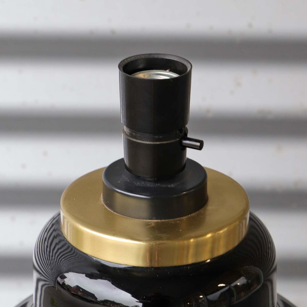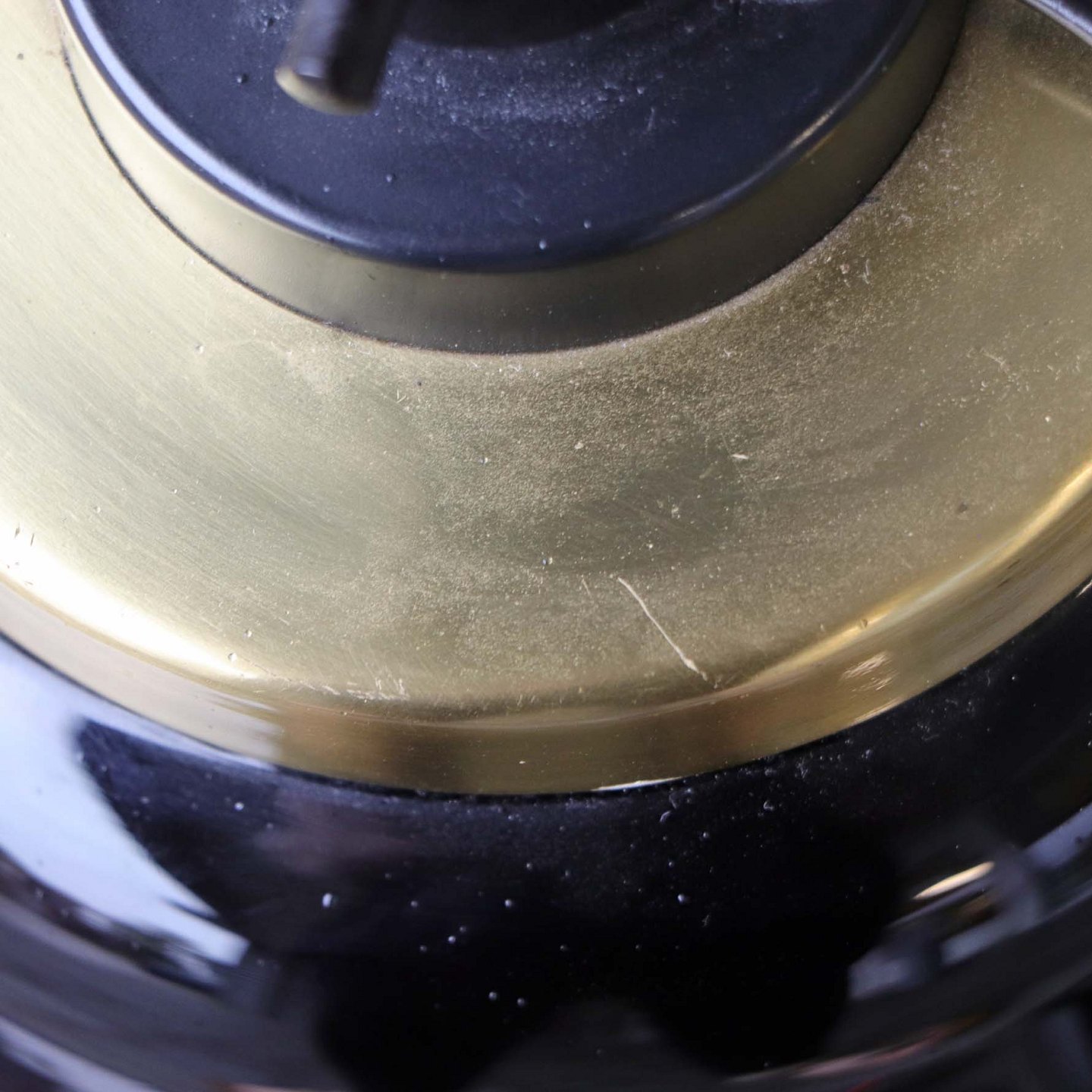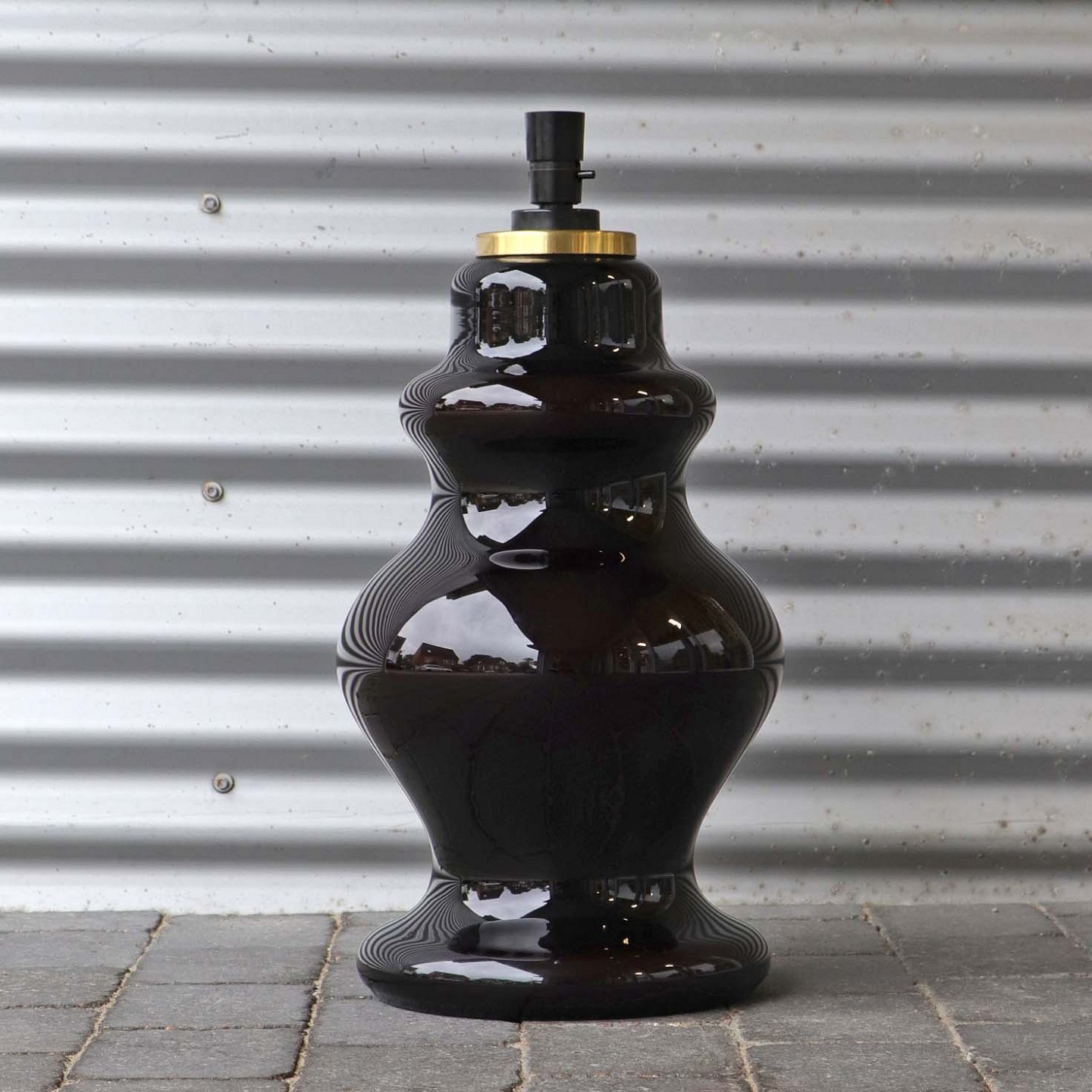 Stor sjælden bordlampe i mundblæst sort glas med mørkerød undertone og messingfarvet top