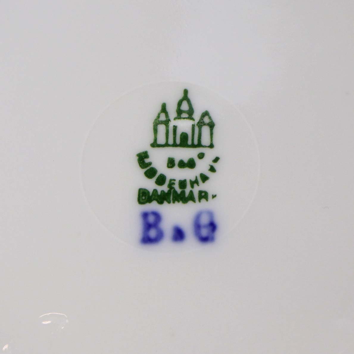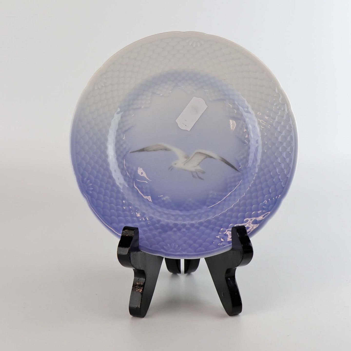 Service i glat porcelæn med skælform i blålige farver og motiv af måger