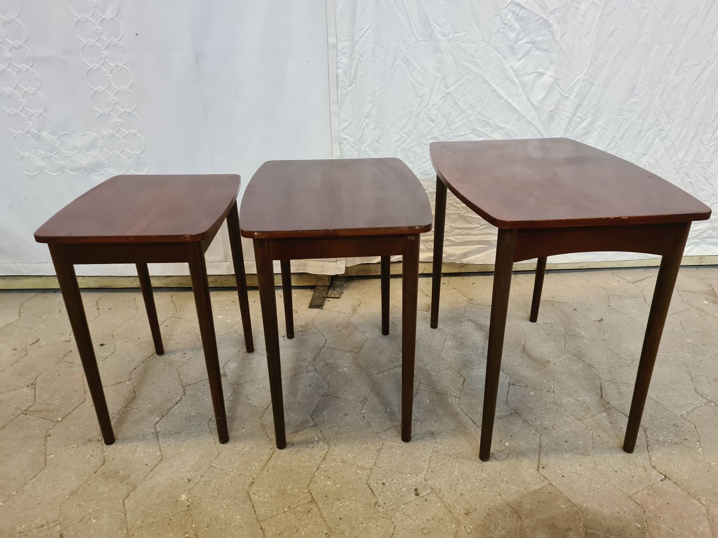3 Indskudsborde i fineret nødetræ, fra 1960erne.