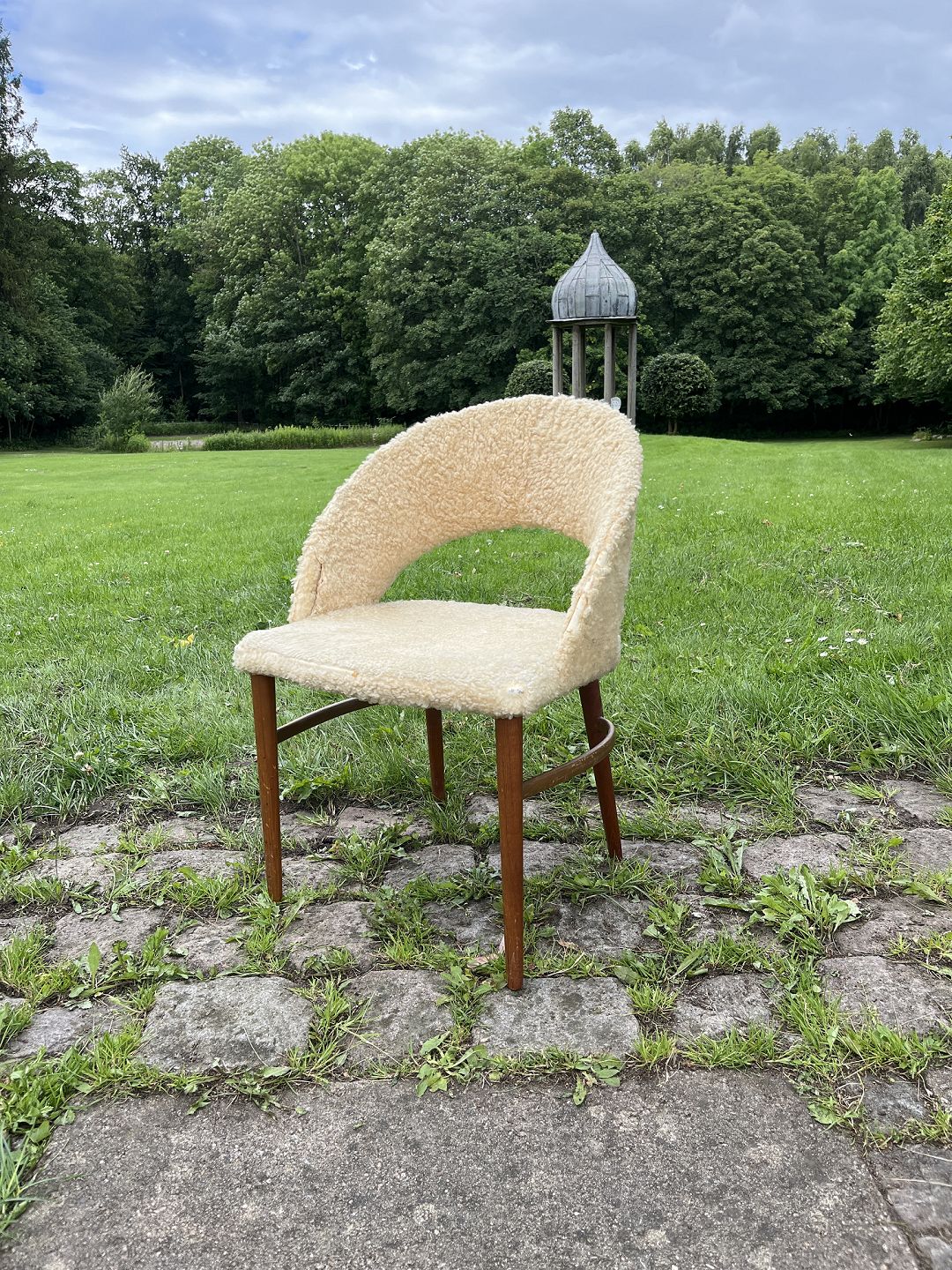 Sminkebordsstol polstret med lammeuld samt stel i teak. Udført hos Snedkermester Frode Holm ca. 1950'erne. Brugt stand, trænger til ombetrækning.