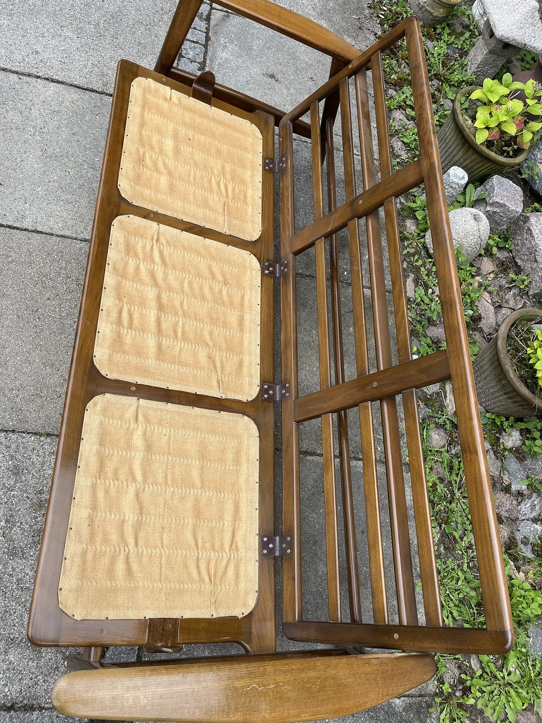 Hans J. Wegner 3. Personers sofa i bejset bøgetræ og fjedrehynder betrukket med Uldstof produceret af Getama i 1950’erne.