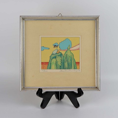 Mindre litografisk tryk i sølvmalet træramme. Litografiet er er dateret 1976 og har en farverig abstrakt komposition med gulligt passepartout nr. 117/200
