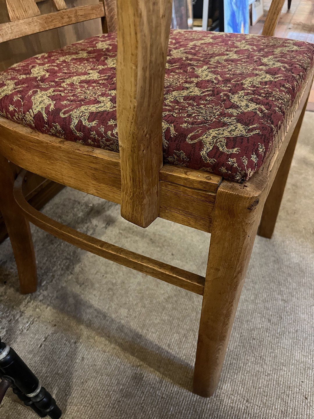 Dansk snedkermester armstol fra omkring 1930’erne i massiv egetræ og sæde i møbelstof.