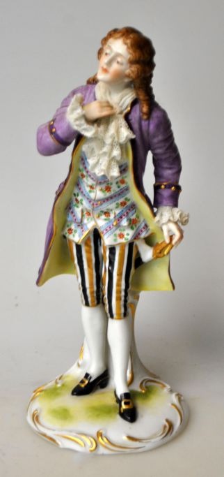 Müller & Co Porcelænsfabrik, porcelænsfigur af ung mand, 3280, 20. årh. Tyskland. Rococofigur. Polykrom håndbemalet figur med forgyldninger. Stemplet. H.: 19 cm.