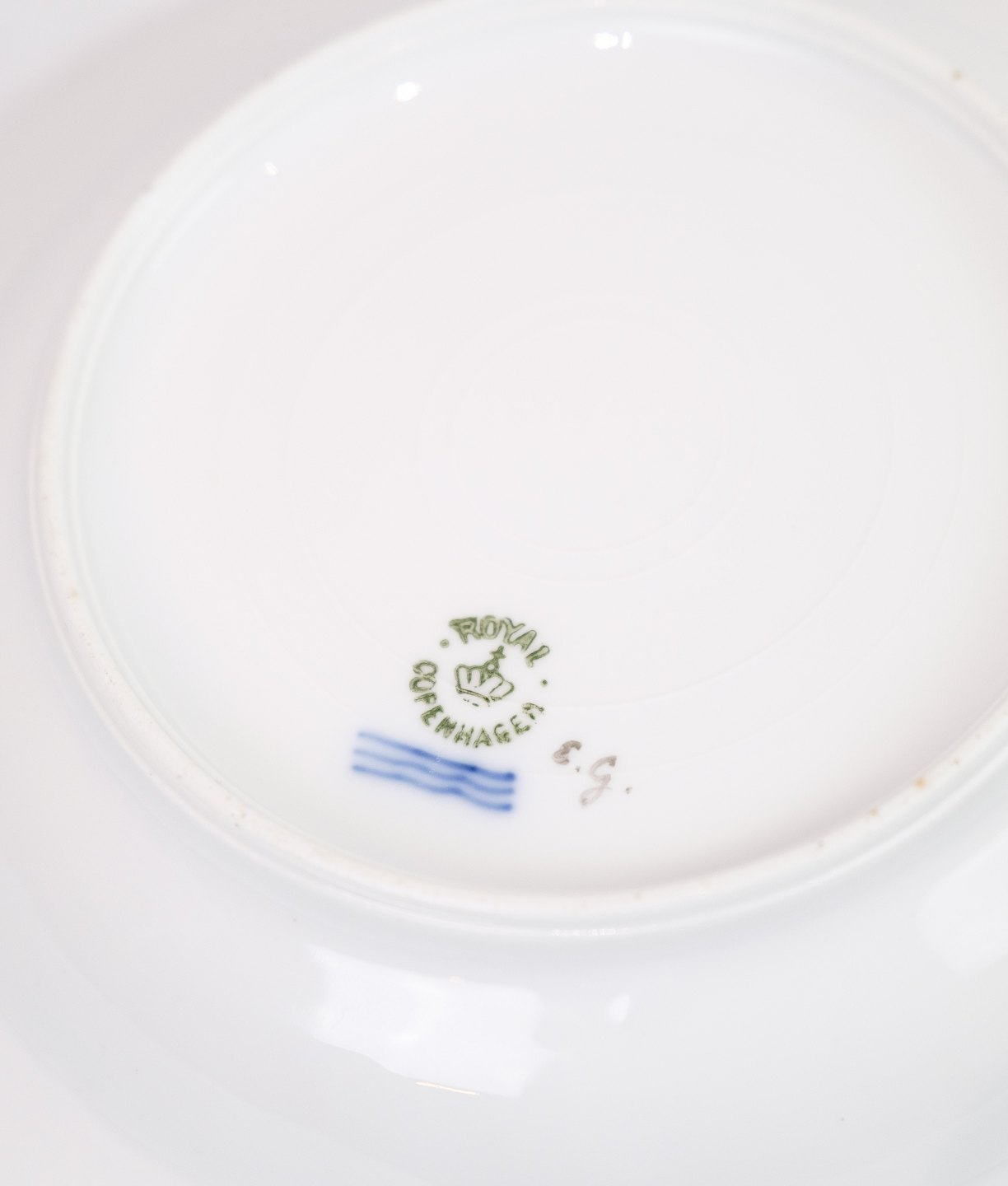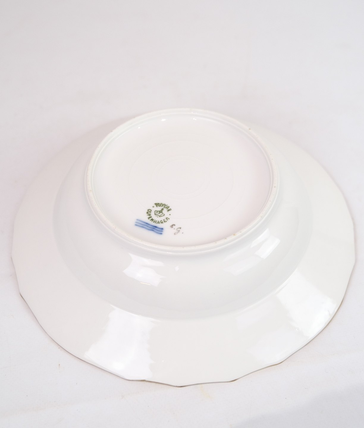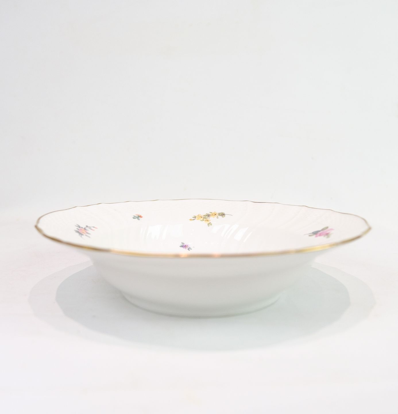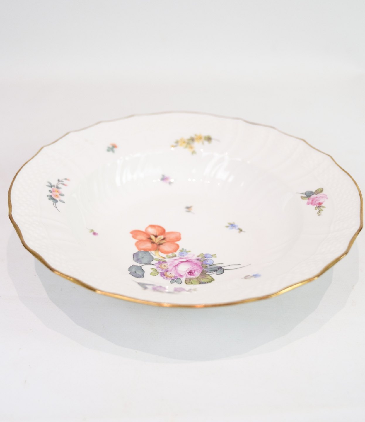 Dybe/Pasta Tallerkener af Kongelig porcelæn med mønstret Saksisk blomst dekoreret i kanten med guld. Fremstillet af Royal Copenhagen i ca. 1923, hvor alle deres varer er blevet håndmalet og efterfølgende blevet meget sjældne. Tallerkenerne står uden mangler eller defekter.