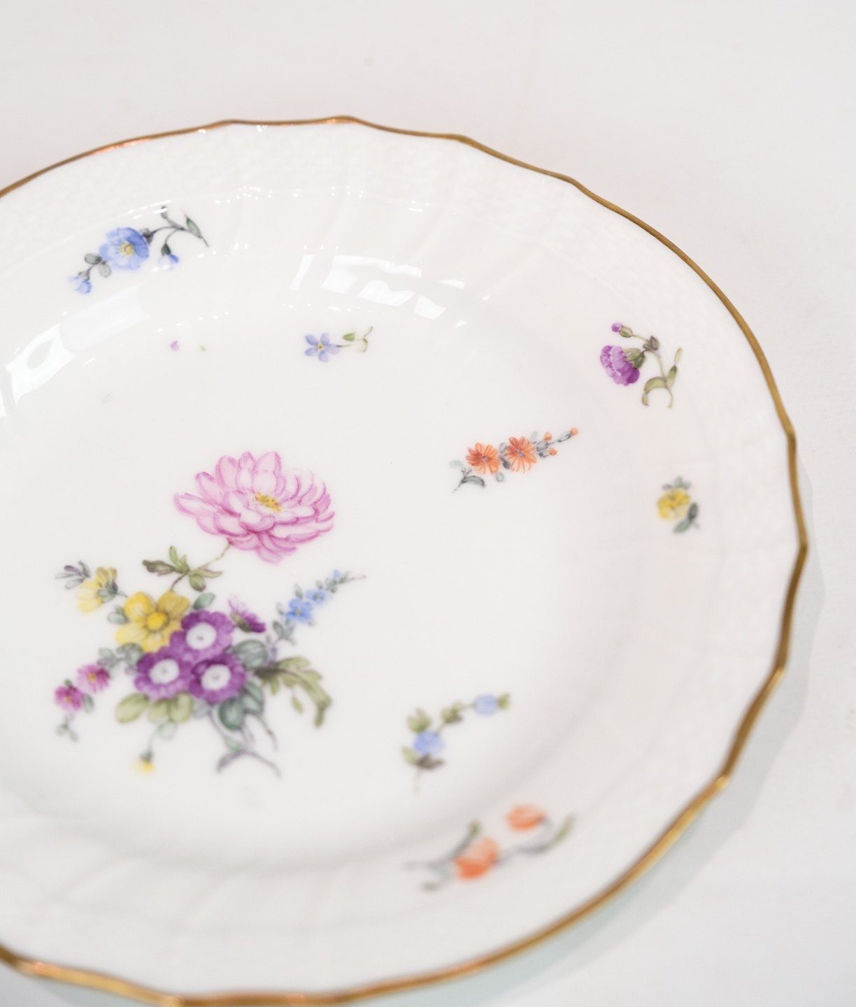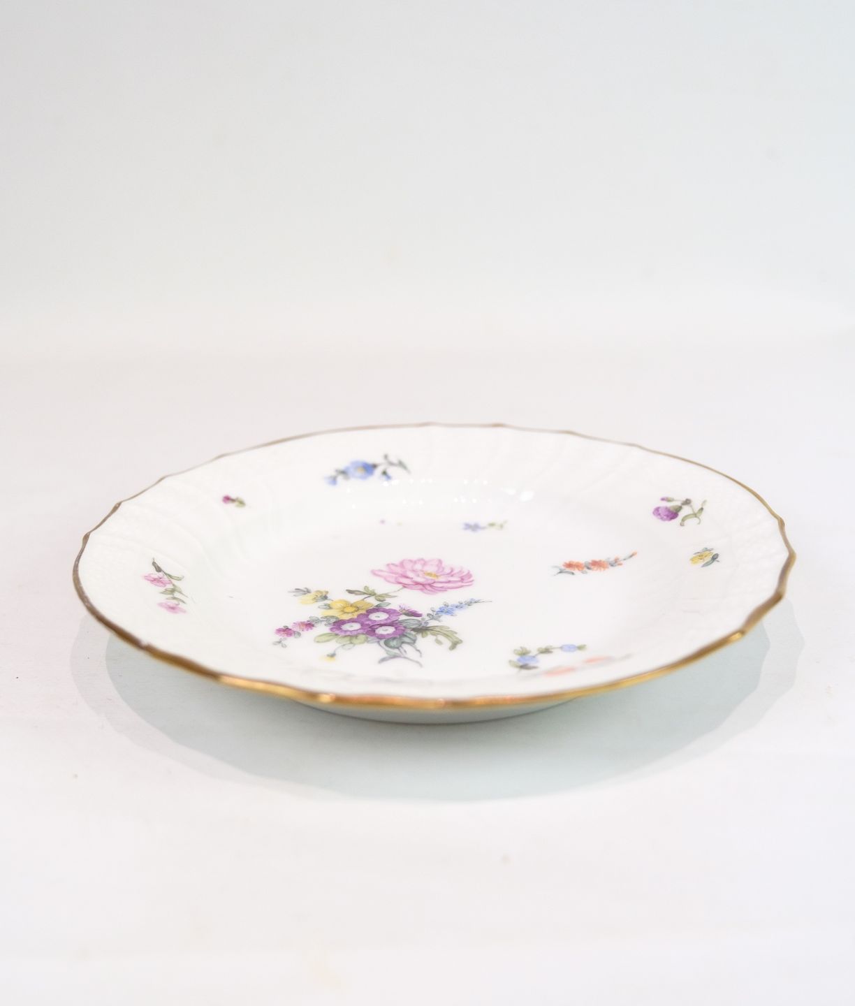 Frokost Tallerkener af Kongelig porcelæn med mønstret Saksisk blomst dekoreret i kanten med guld. Fremstillet af Royal Copenhagen i ca. 1923, hvor alle deres varer er blevet håndmalet og efterfølgende blevet meget sjældne. Alle frokost tallerkener står uden mangler eller defekter.