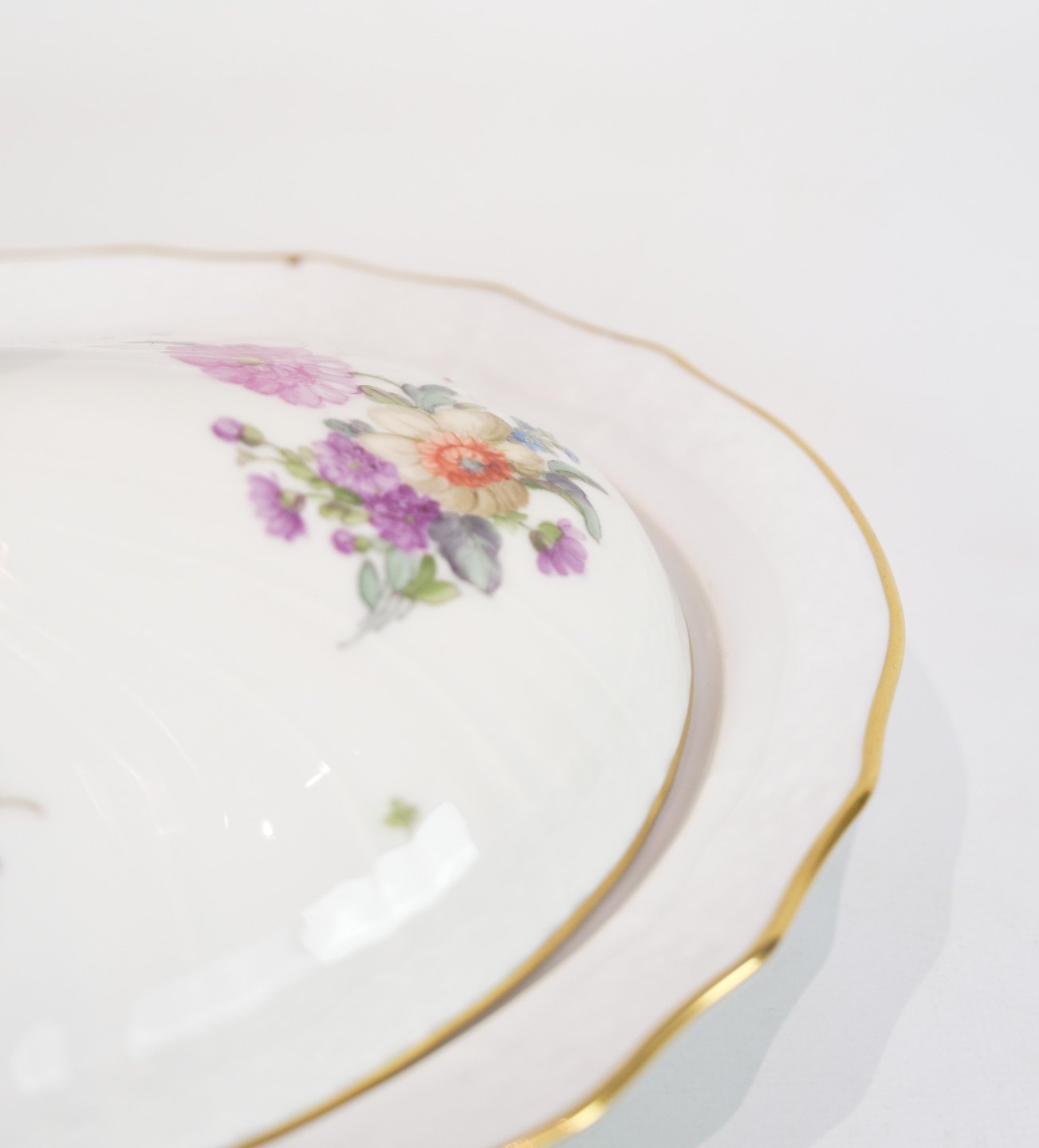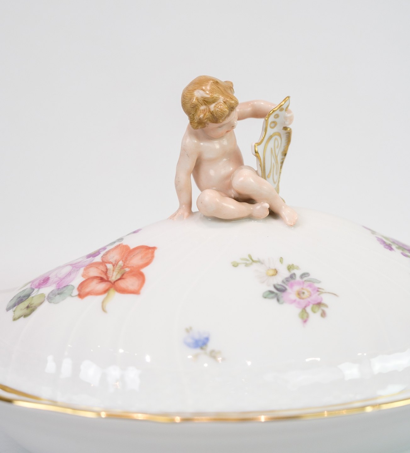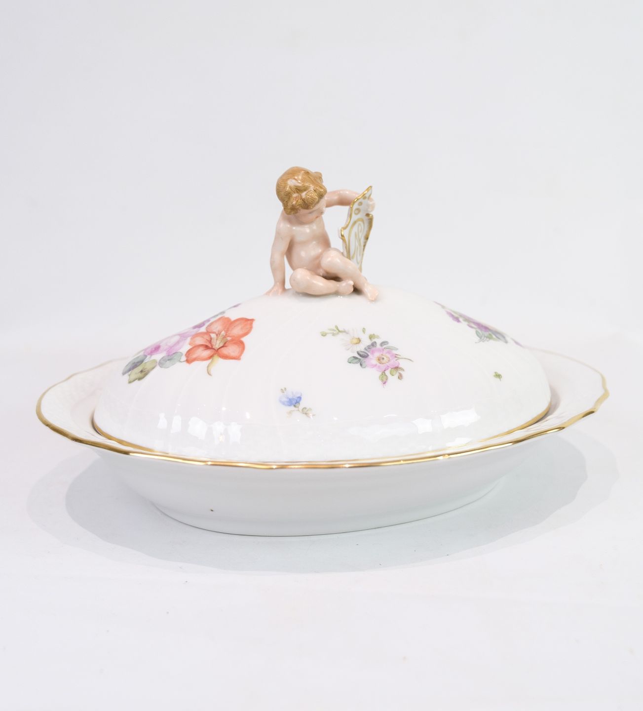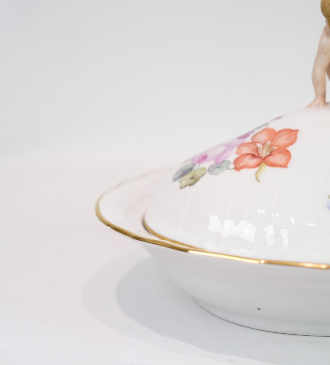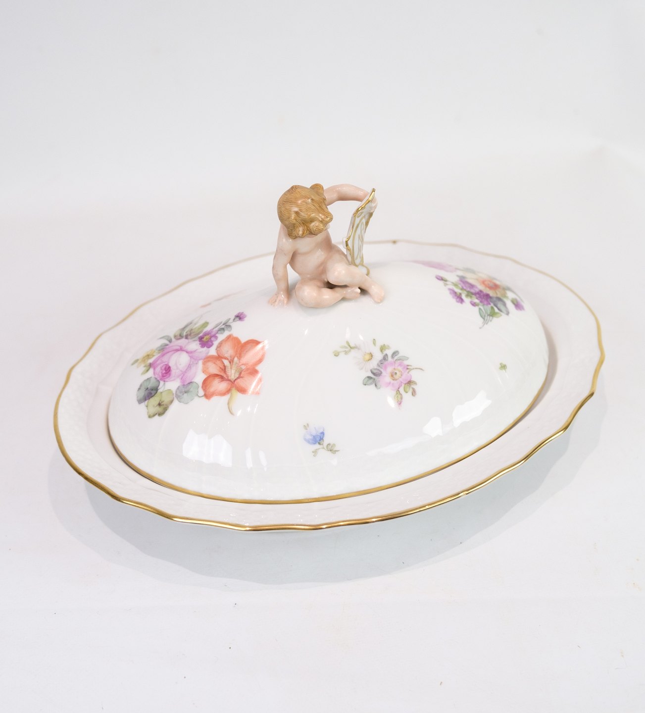 Stort Låg Fad dekoreret med en "Putti" siddende på låget lavet af Kongelig porcelæn med mønstret Saksisk blomst dekoreret i kanterne med guld. Fremstillet af Royal Copenhagen i ca. 1923, hvor alle deres varer er blevet håndmalet og efterfølgende blevet meget sjældne. Fadet står uden mangler eller defekter.