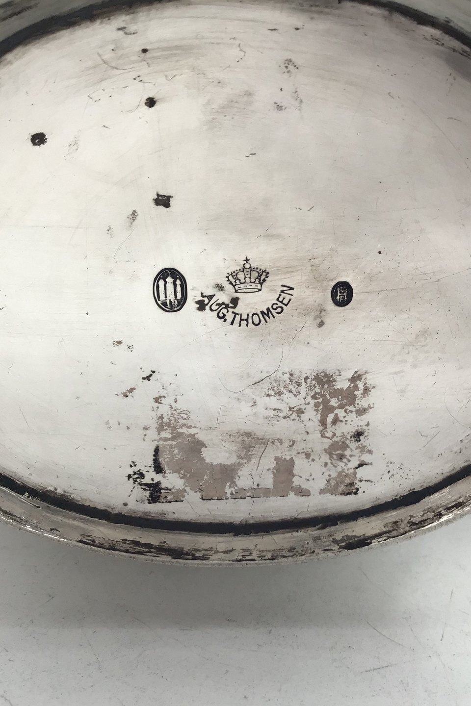 August Thomsen Sølv Thekande (1919) Måler H 16 cm (6.29 inch) L 29 cm (11.41 inch) B 12.5 cm (4.92 inch) Vægt 591.6 gr (20.87 oz)