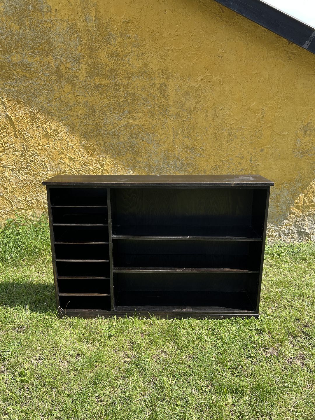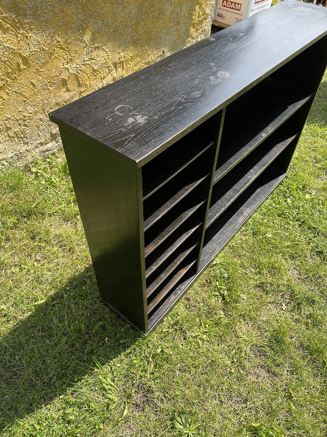 Text available in Danish: Reol udført i massiv sortlaseret egetræ med delvis justerbar hylder.
