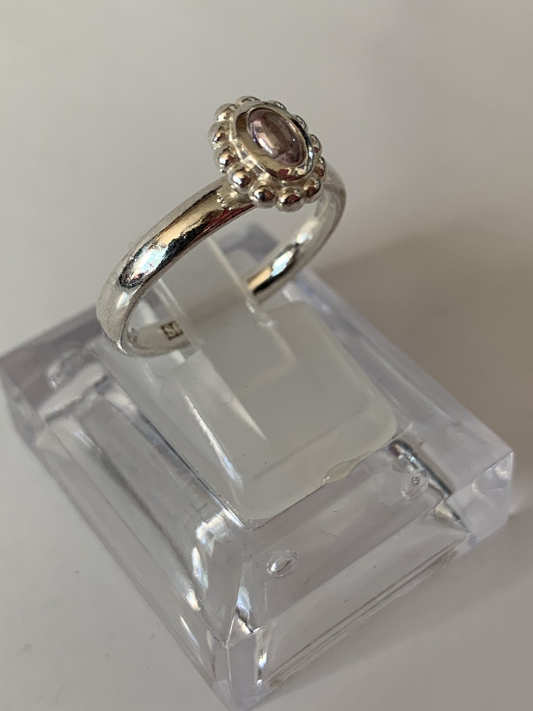 Fin sølvring i rustik design, med flot lilla sten og ornamenteringer på toppen af ringen. Ringen er lavet i et simpelt og stilrent design, så ringen kan bæres til nærmest alt slags tøj. Der er ingen skarpe linjer, men et rent roligt blødt design, der henleder tanken på mormors smykkeskrin. En smuk sølvring, der kan bæres af både unge piger og den modne kvinde.