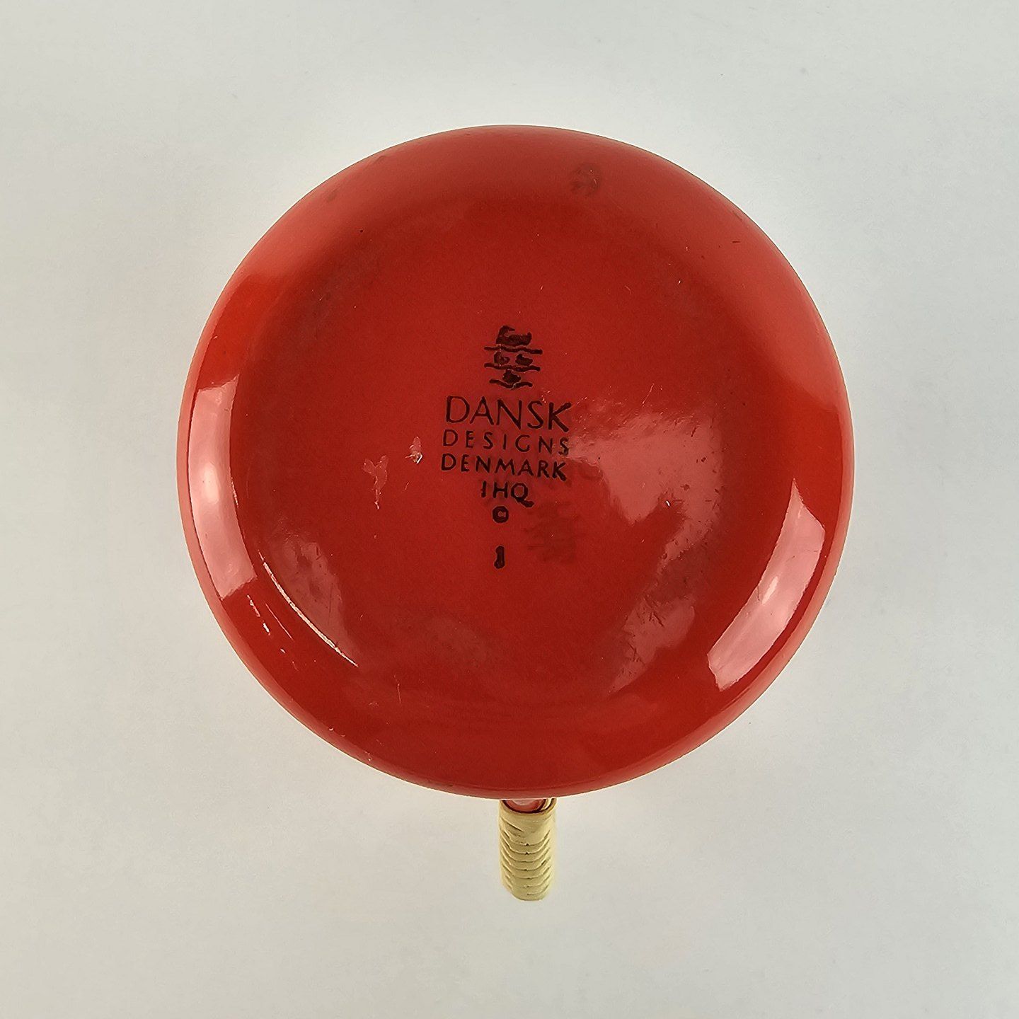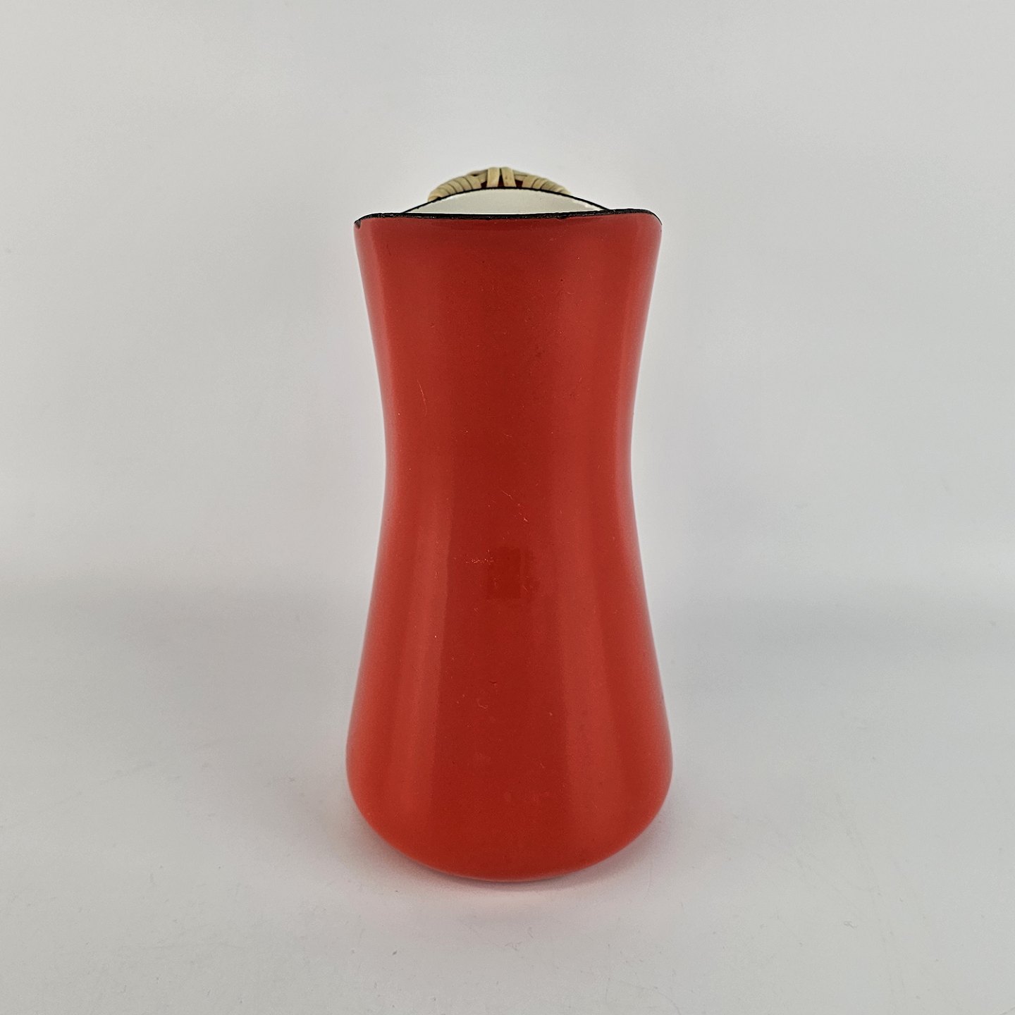 Rød emaljekande med hvid emaljebelægning på indersiden samt hank omviklet af flettet plast