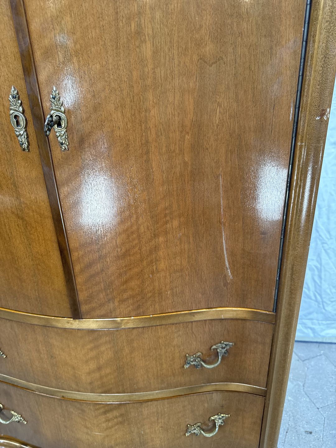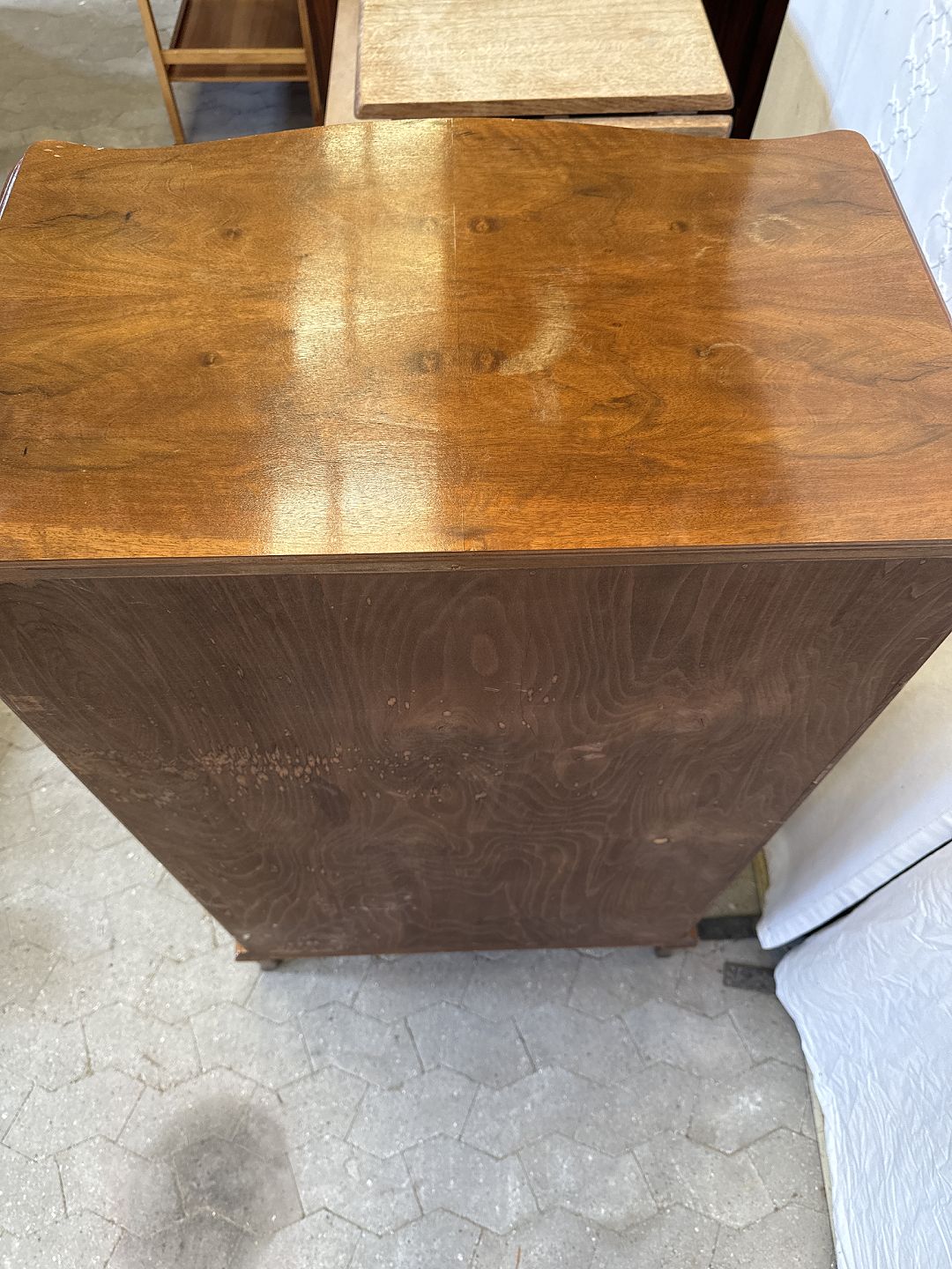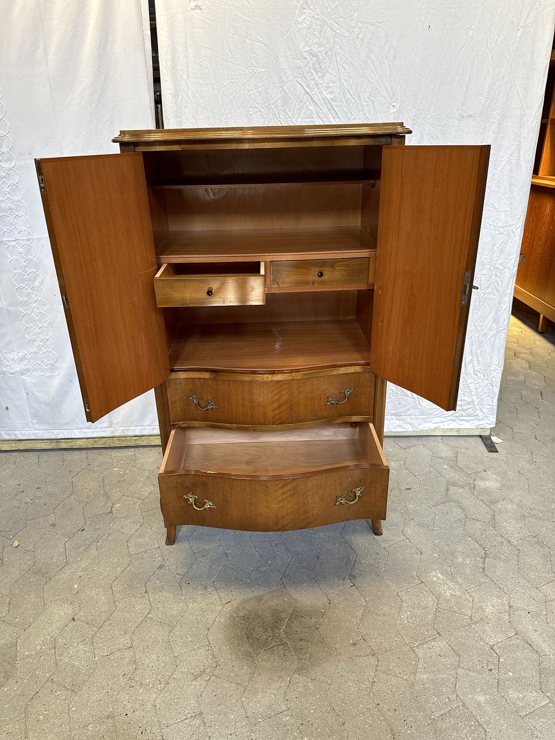 Dækketøjsskab i fineret nøddetræ, fra 1950'erne. Det har brugsspor.