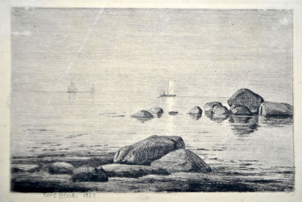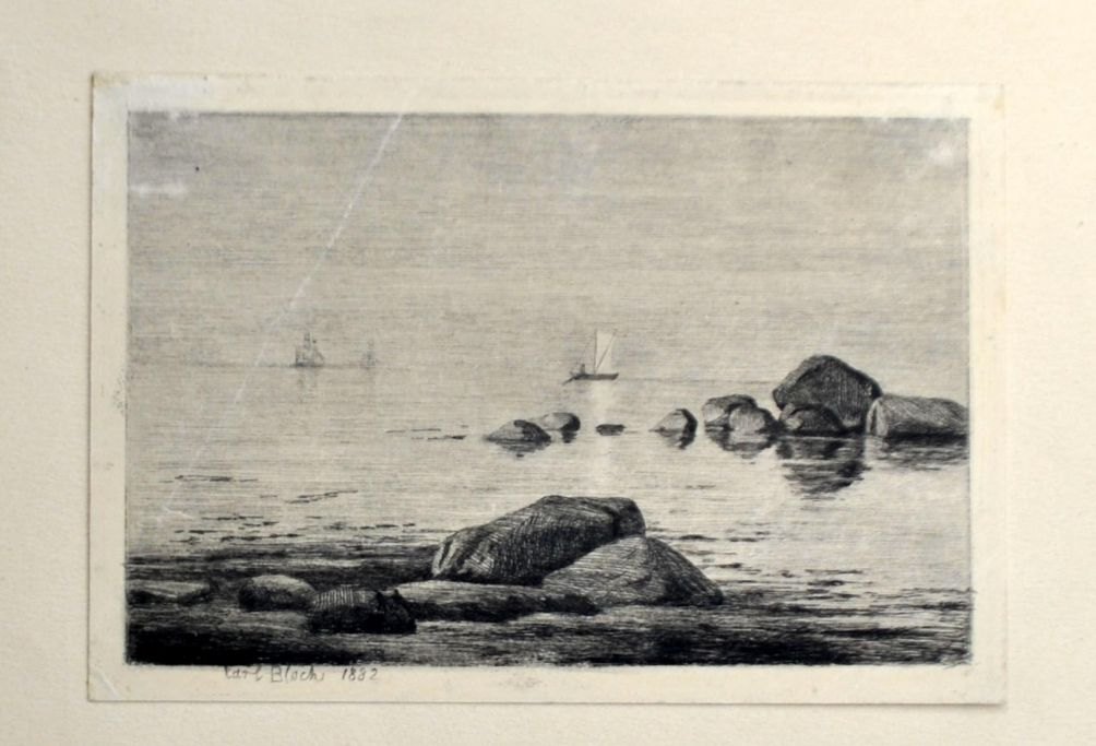 Bloch, Carl (1834 - 1890) Danmark: Strandparti fra Hellebæk, diset luft. Radering. Signeret: Carl Bloch 1882. 7,5 x 11,5 cm.