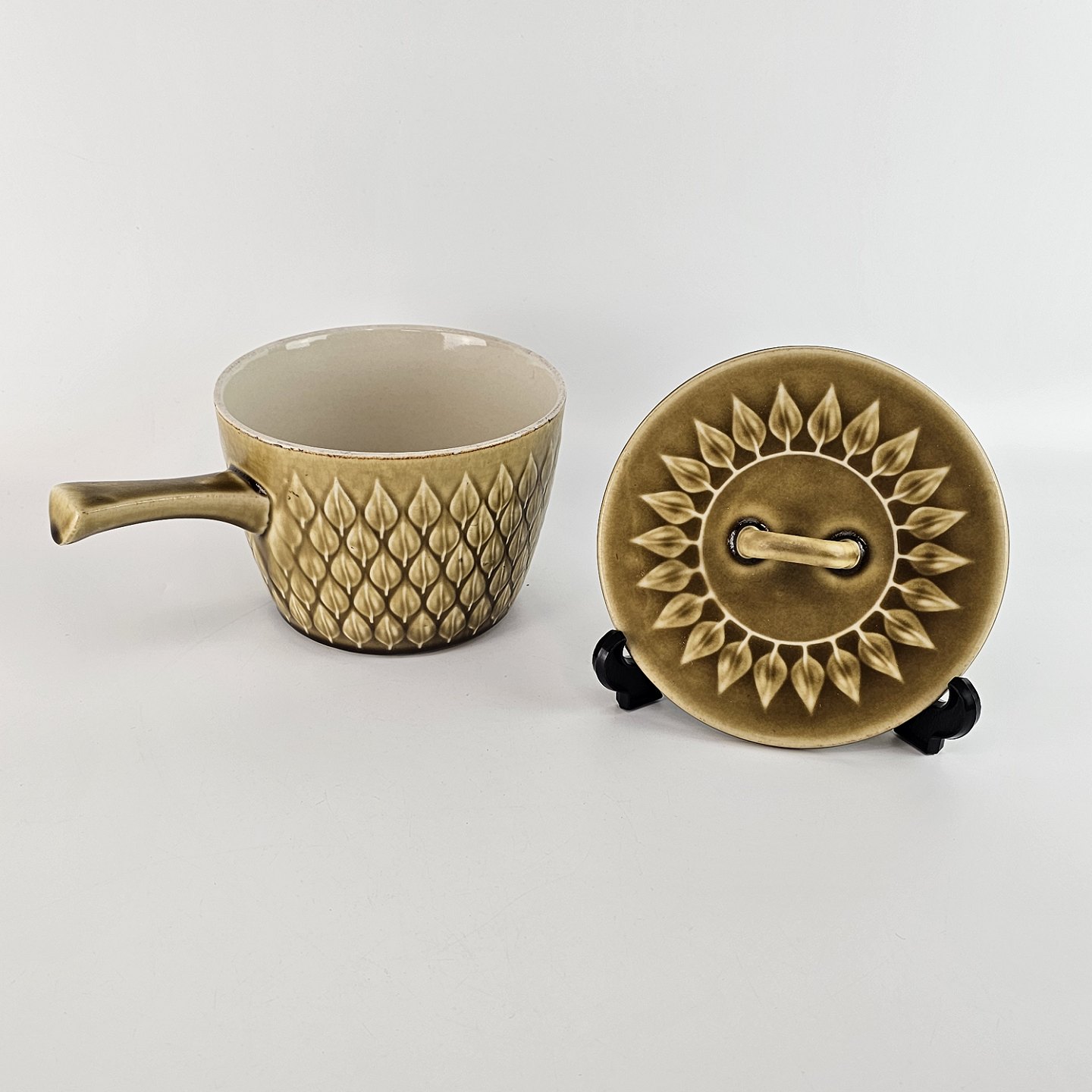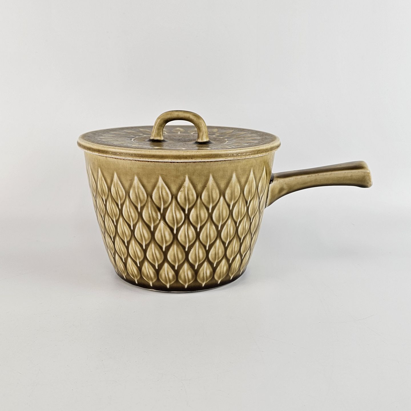 Skål med hank og låg i stentøj fra stellet Relief