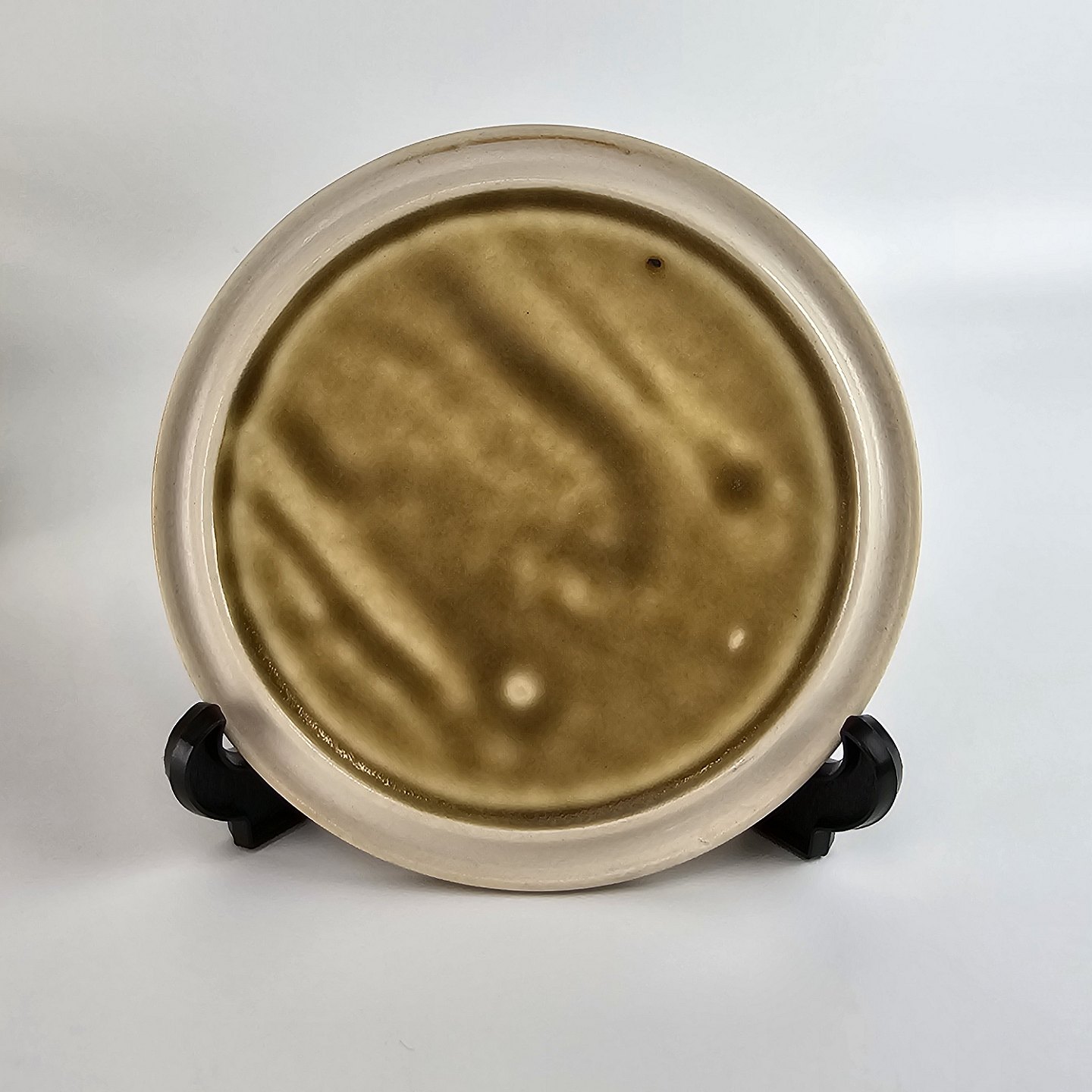 Gult stentøj med mønster af blade. Brugsspor kan forekomme