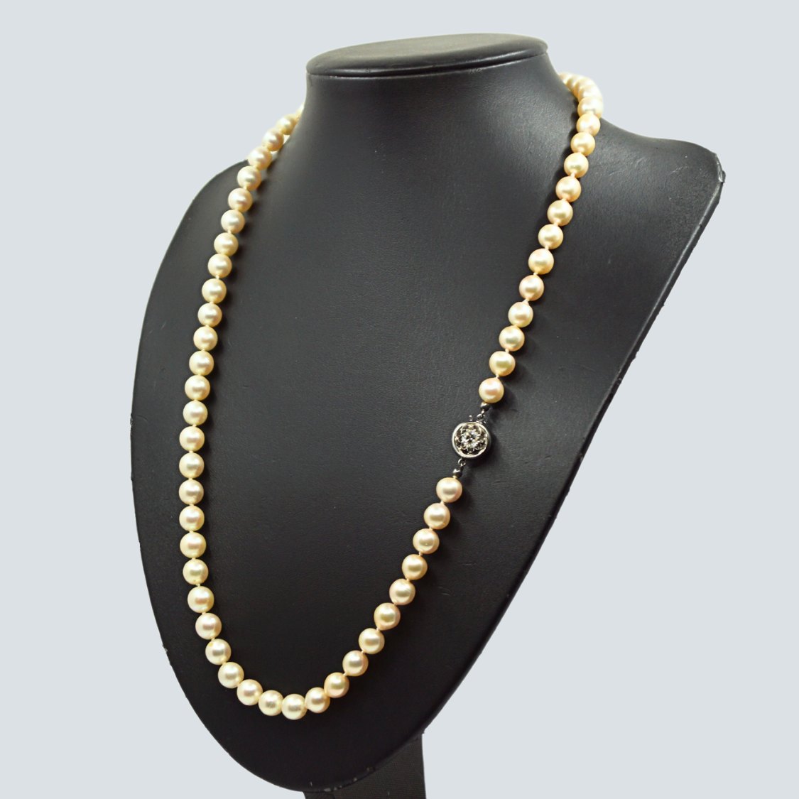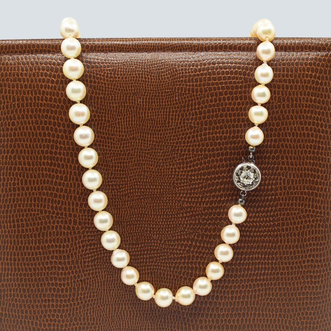 Hugo Grün; Perlekæde prydet med diamantlås, 14 kt. hvidguld