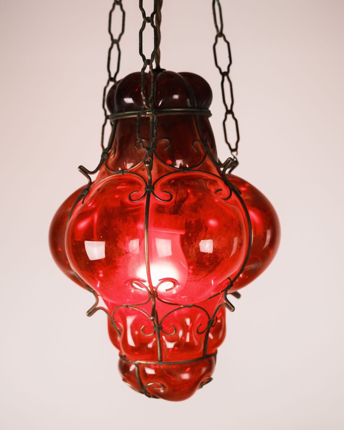 Lamp/Grid Pendant - Ruby Red Glass - Venetian Style - 1950s