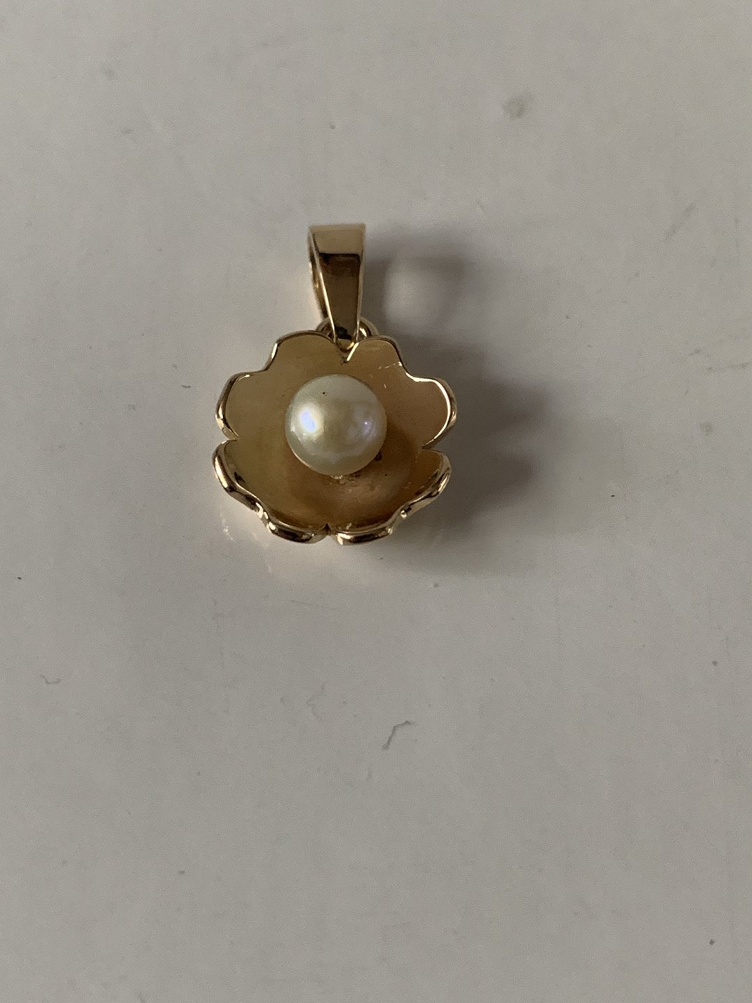 Guldvedhæng i 14 karat guld, med en indlagt perle. og vil være ideelt til en tynd guldkæde. Her vil det være et diskret, men elegant halssmykke til både hverdag og fest. Vedhænget er formet smukt. Det er elegant, og flot udført.