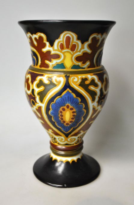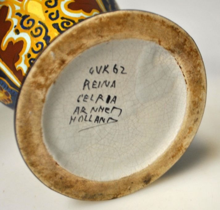 Fajance vase, art nouveau, Reina Celria, Arnheim, Holland, 20. årh. Polykrom håndbemalet. Stemplet. CVK 62. Højde.: 24 cm.