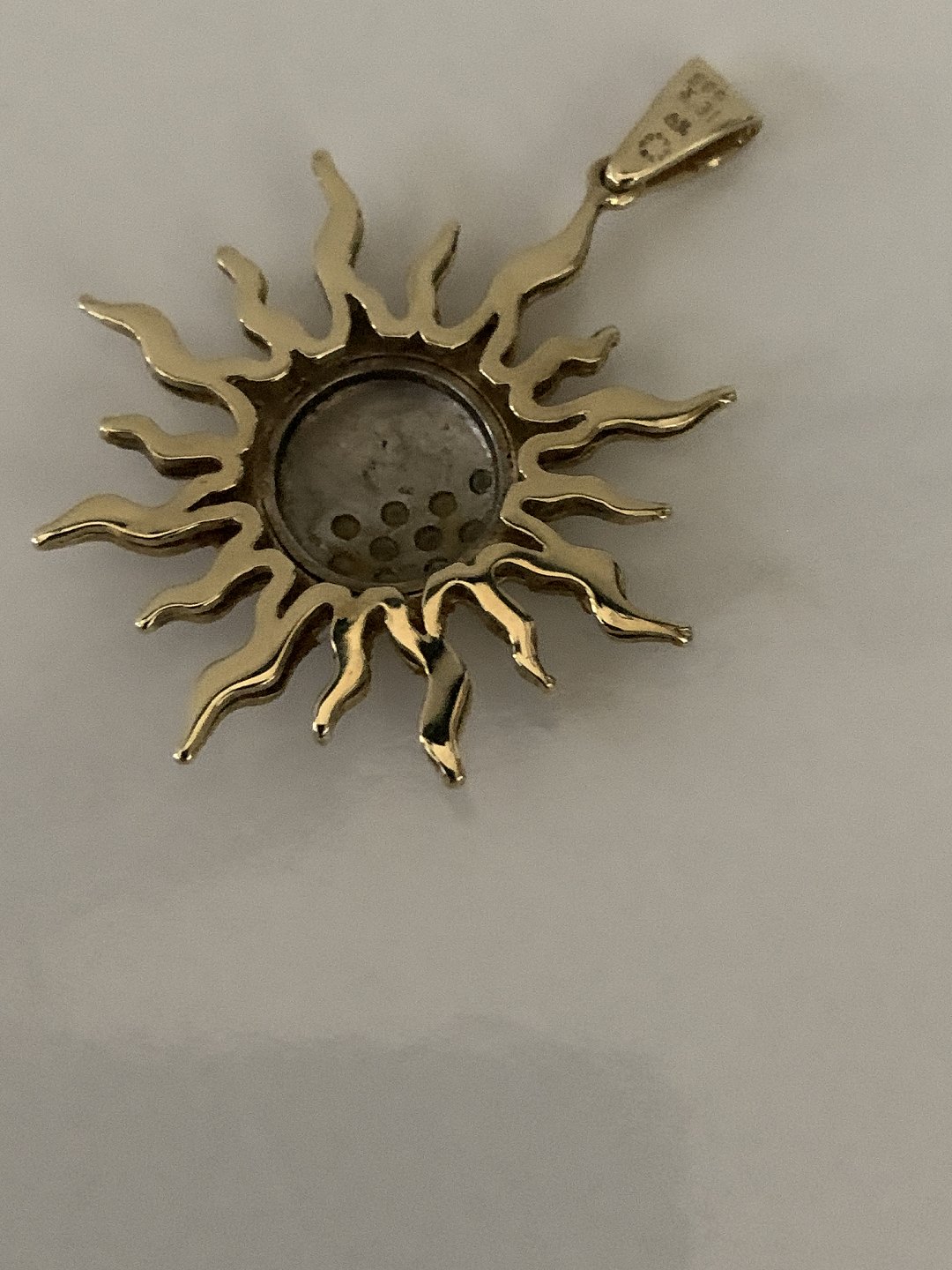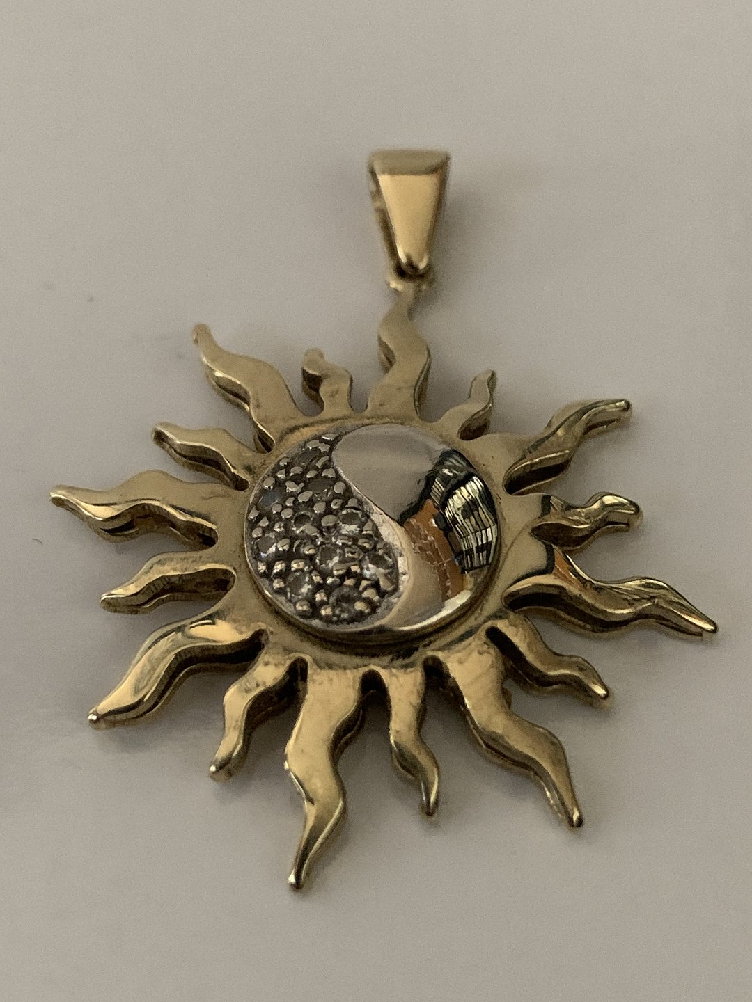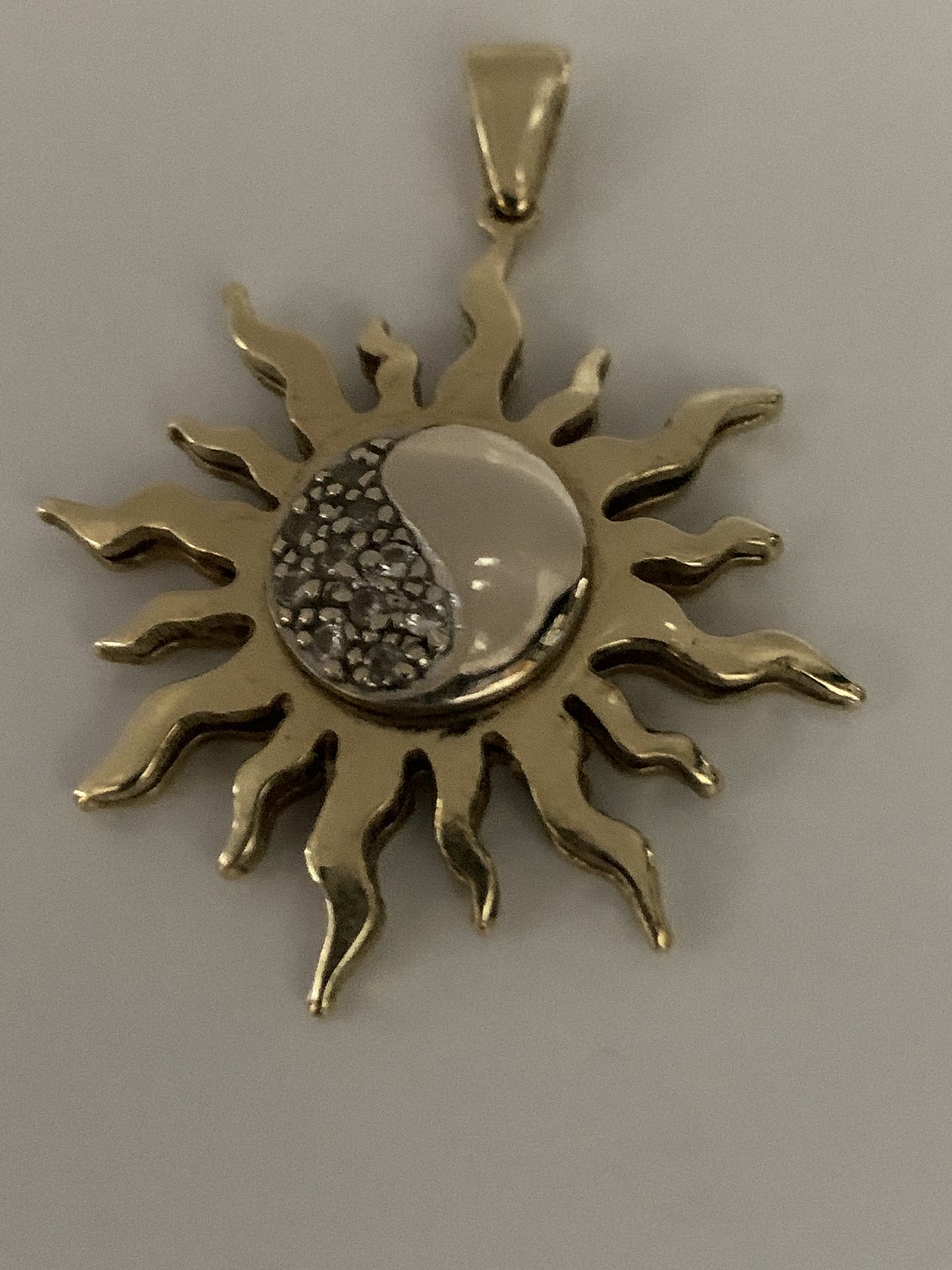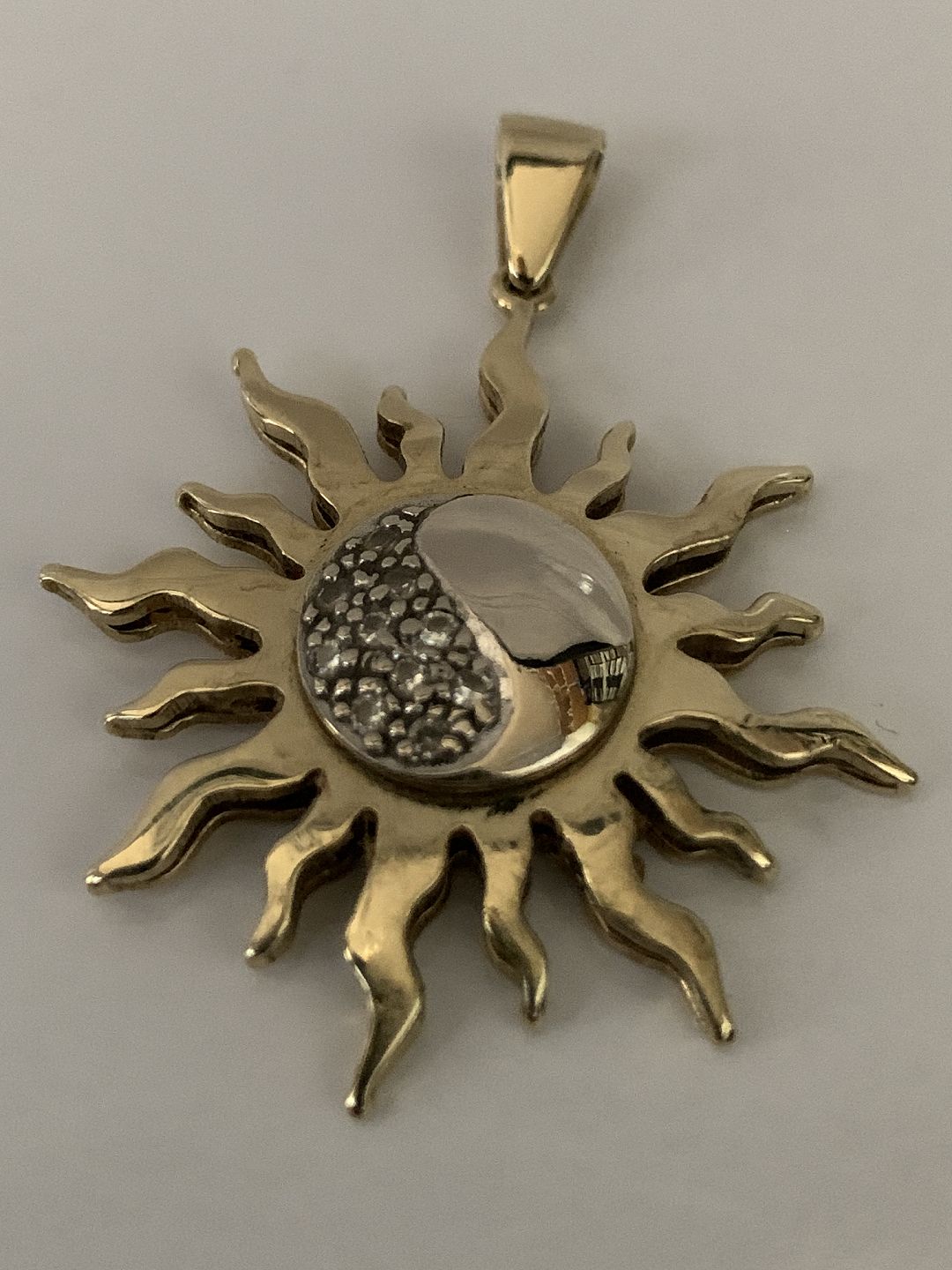 Vedhæng i 14 karat guld, sol med yin-yang og små hvide sten, og med flotte detaljer og mønstre. Vedhænget udstråler stor energi og styrke. Vedhænget er lavet med mange fine detaljer, der vil komme fuldt til udtryk hvis man kombinerer vedhænget med en massiv guldkæde.