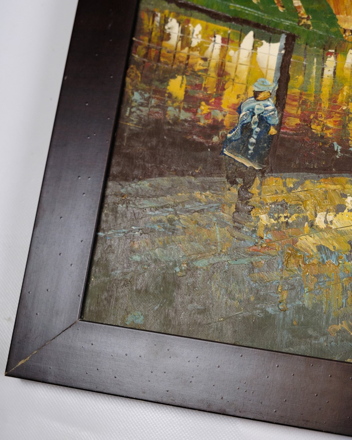 Oliemaleri med motiv af en sensommeraften i Paris, hvor Eiffeltårnet kan ses i baggrunden.