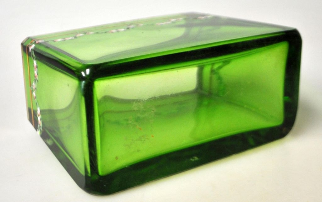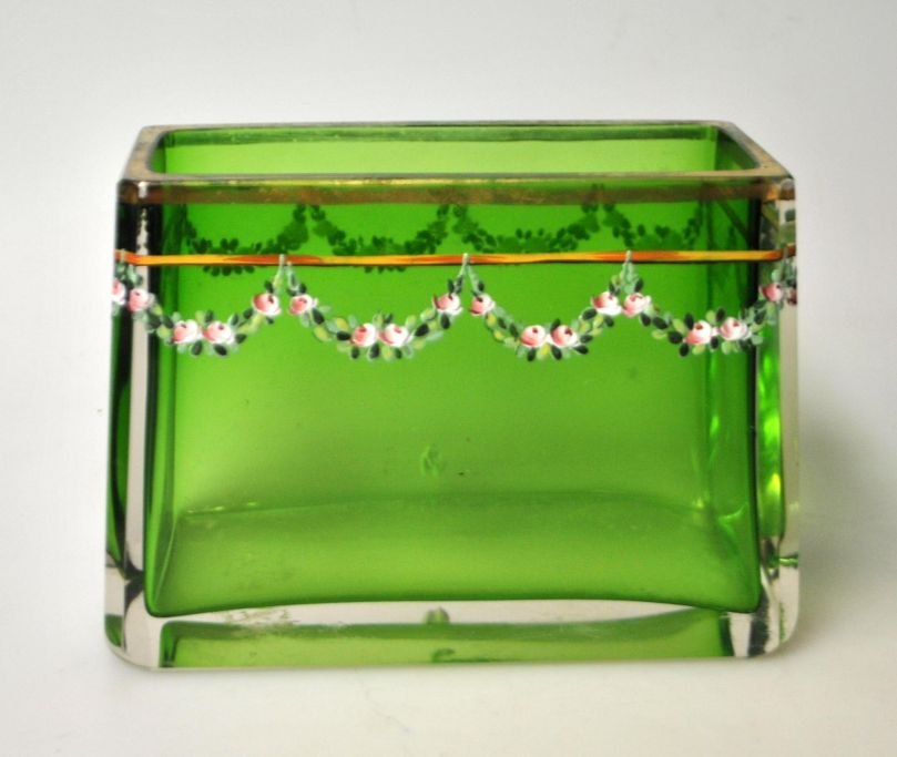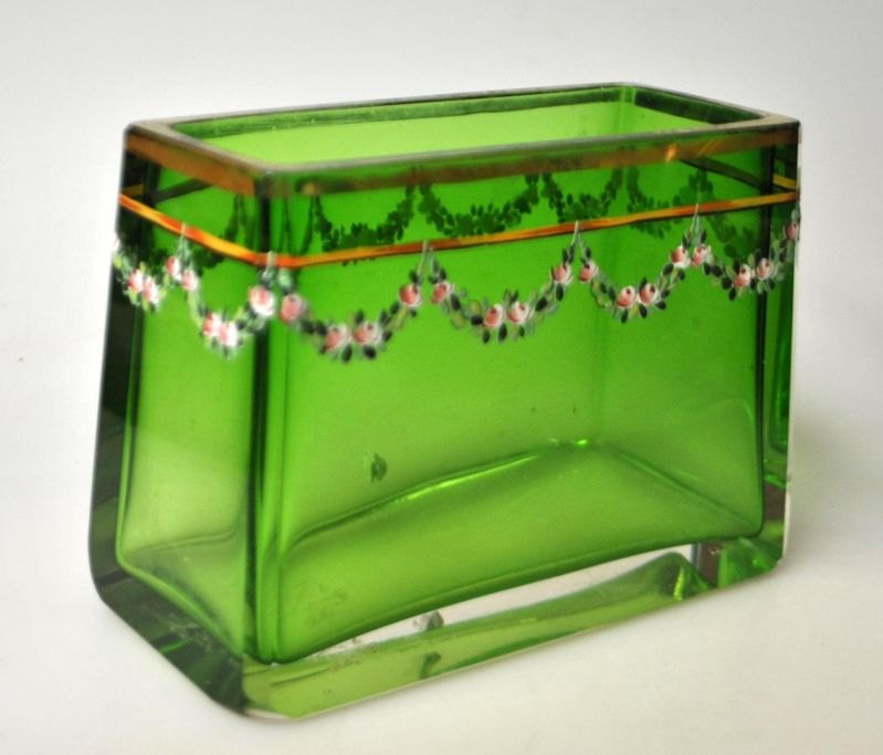 Josef Riedel konisk udformet vase med emaljemaling, ca. 1900-1910. Grønt krystal glas med forgyldninger og håndmalede rosen guirlander. H.: 9,3 cm. L.: 13,1 cm. B.: 6,1 cm.