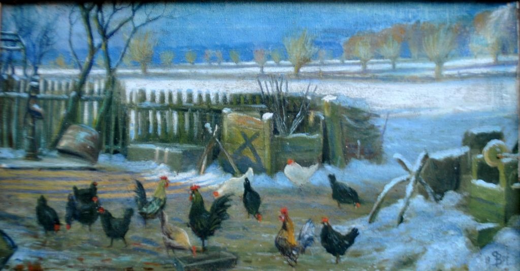 Berthelsen, Christian (1839 - 1909) Danmark: Høns ved en gård, vinter.