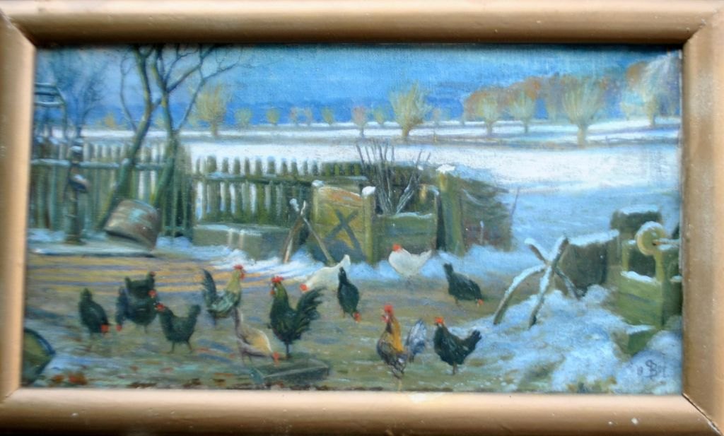 Berthelsen, Christian (1839 - 1909) Danmark: Høns ved en gård, vinter. Olie på lærred. Signeret: Monogram 1904. 29 x 53 cm.
