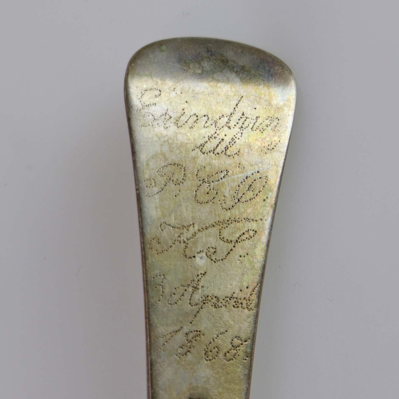 Antik riflet spiseske i sølv med monogrammet M.P. 1918 og på bagsiden teksten Erindring til P.G.P. K.J. 1868