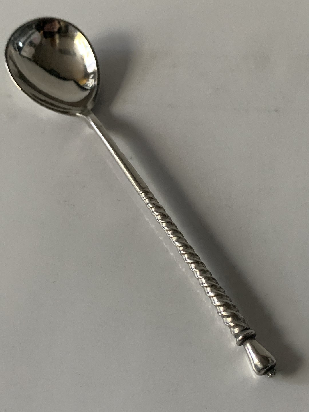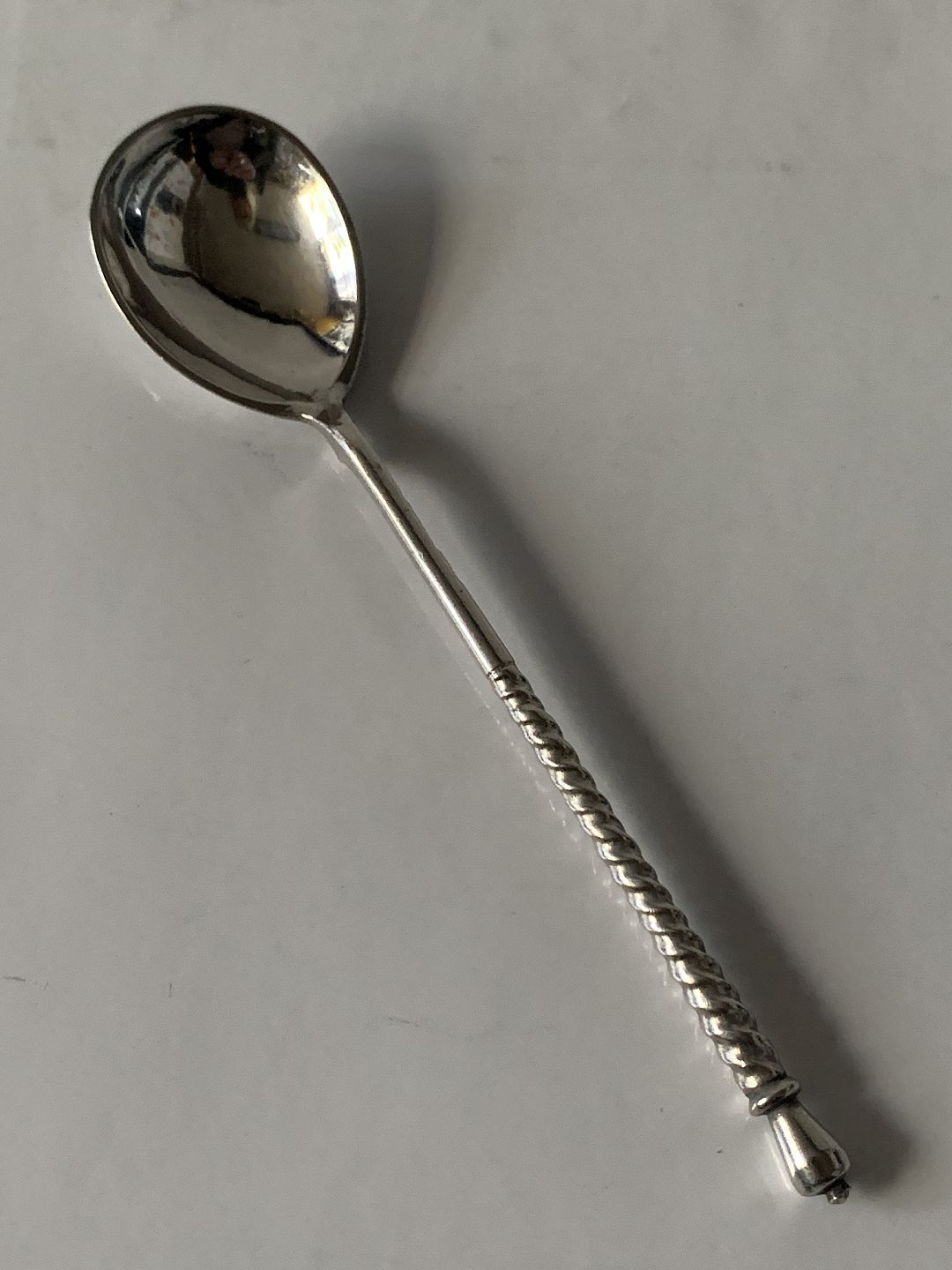 er i sølv, hvor bagsiden af skeen er rigt dekoreret, halvt snoet skaft